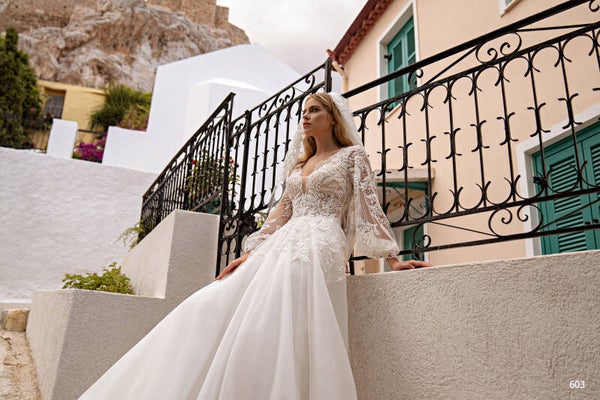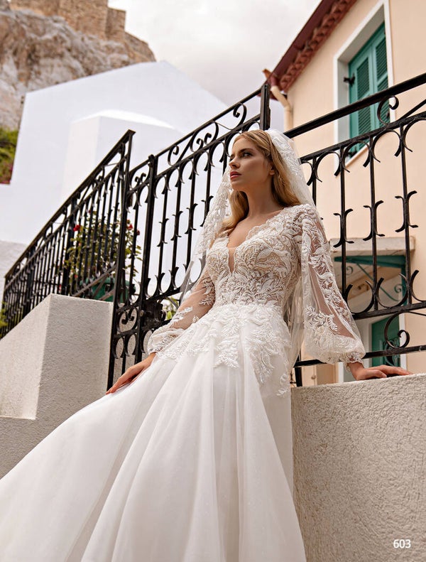 A-line wedding dress with a V-neckline and long sleeves made of embroidered lace with beads, pearls, and sequins.