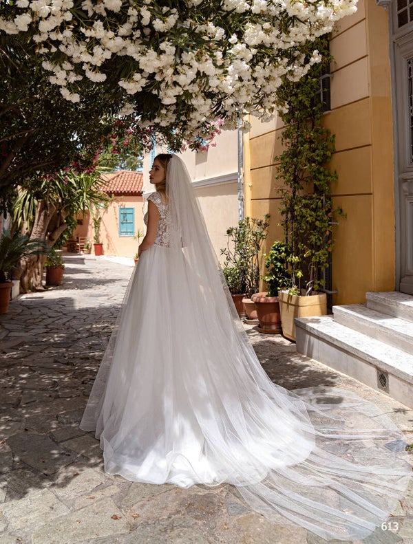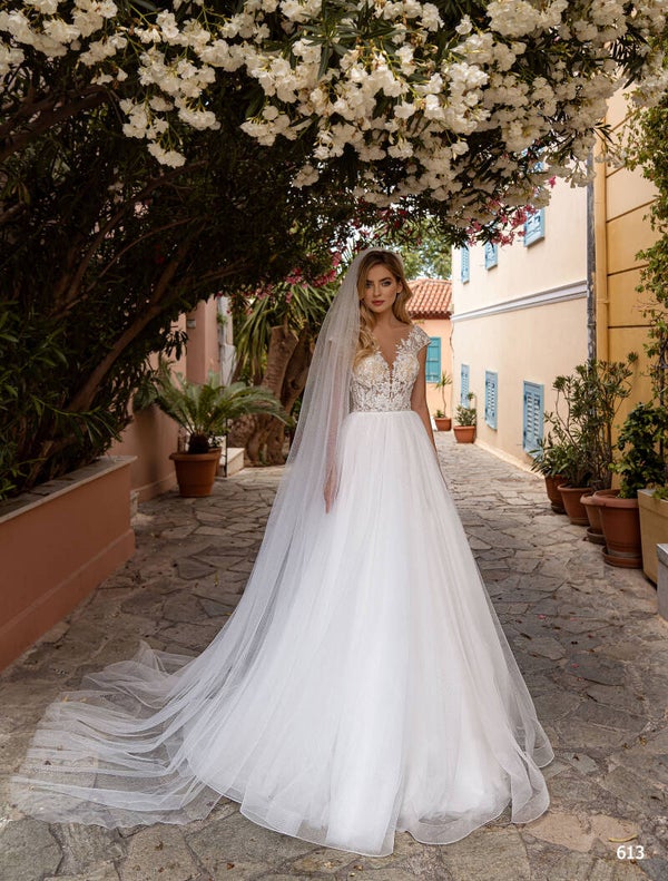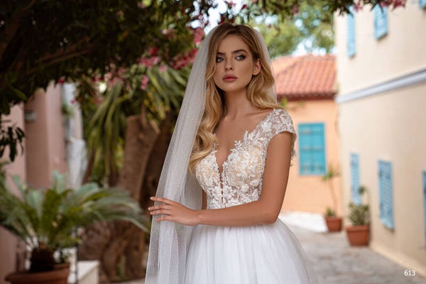 Feminine wedding dress with a V-neckline and a sparkling skirt.