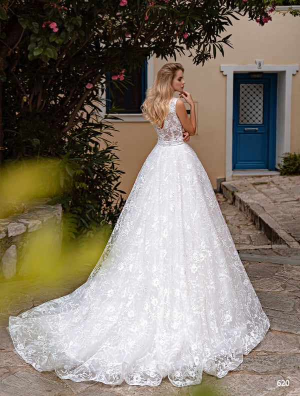 Beautiful wedding dress with an attractive V-neckline and lace skirt with a train.