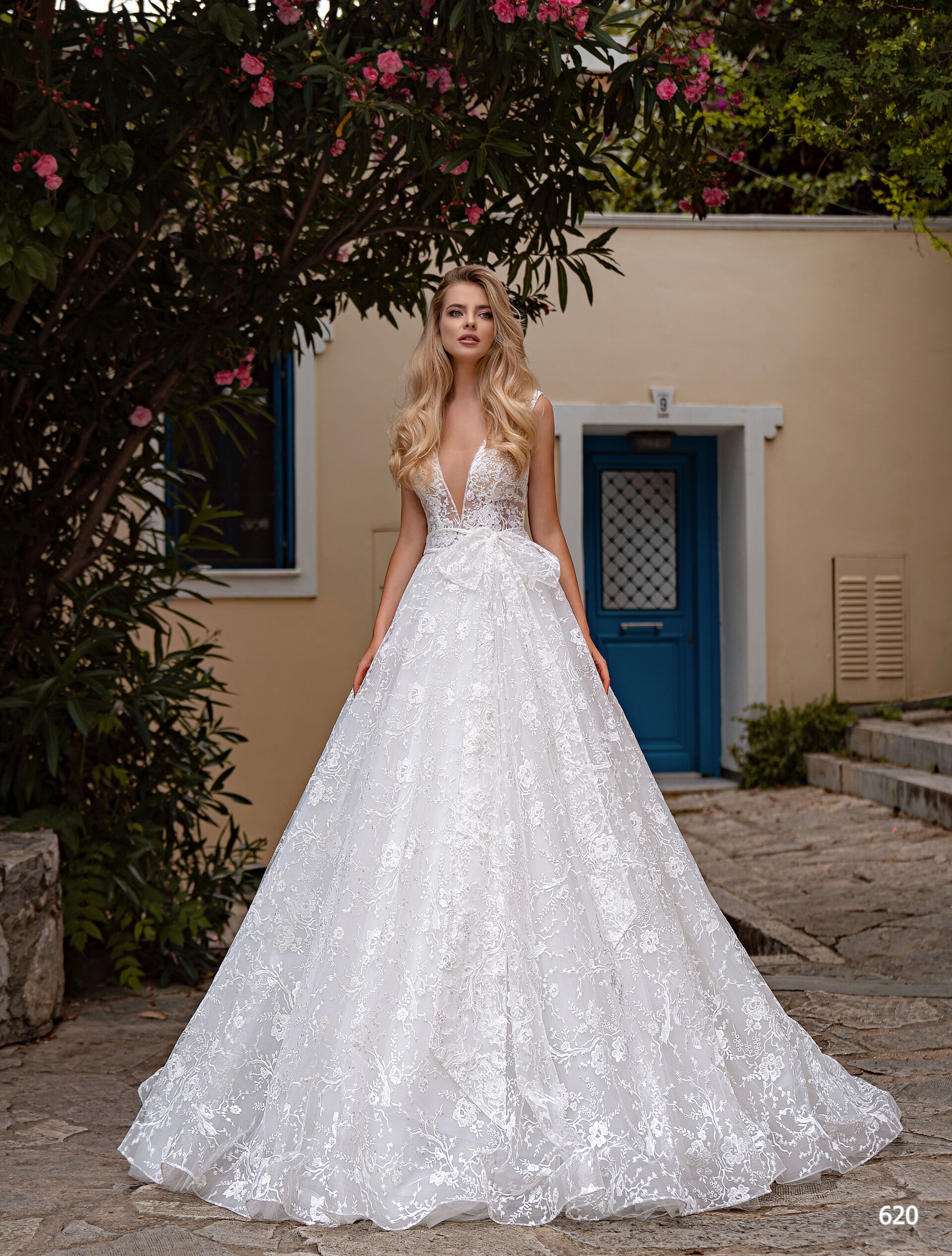 The bodice is made of organza and lace with sequins, decorated with beads and sequins, and also has a bow-shaped belt!