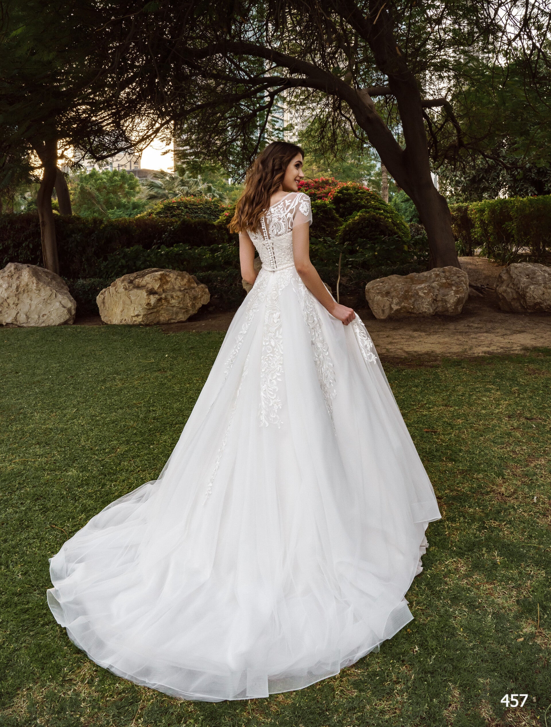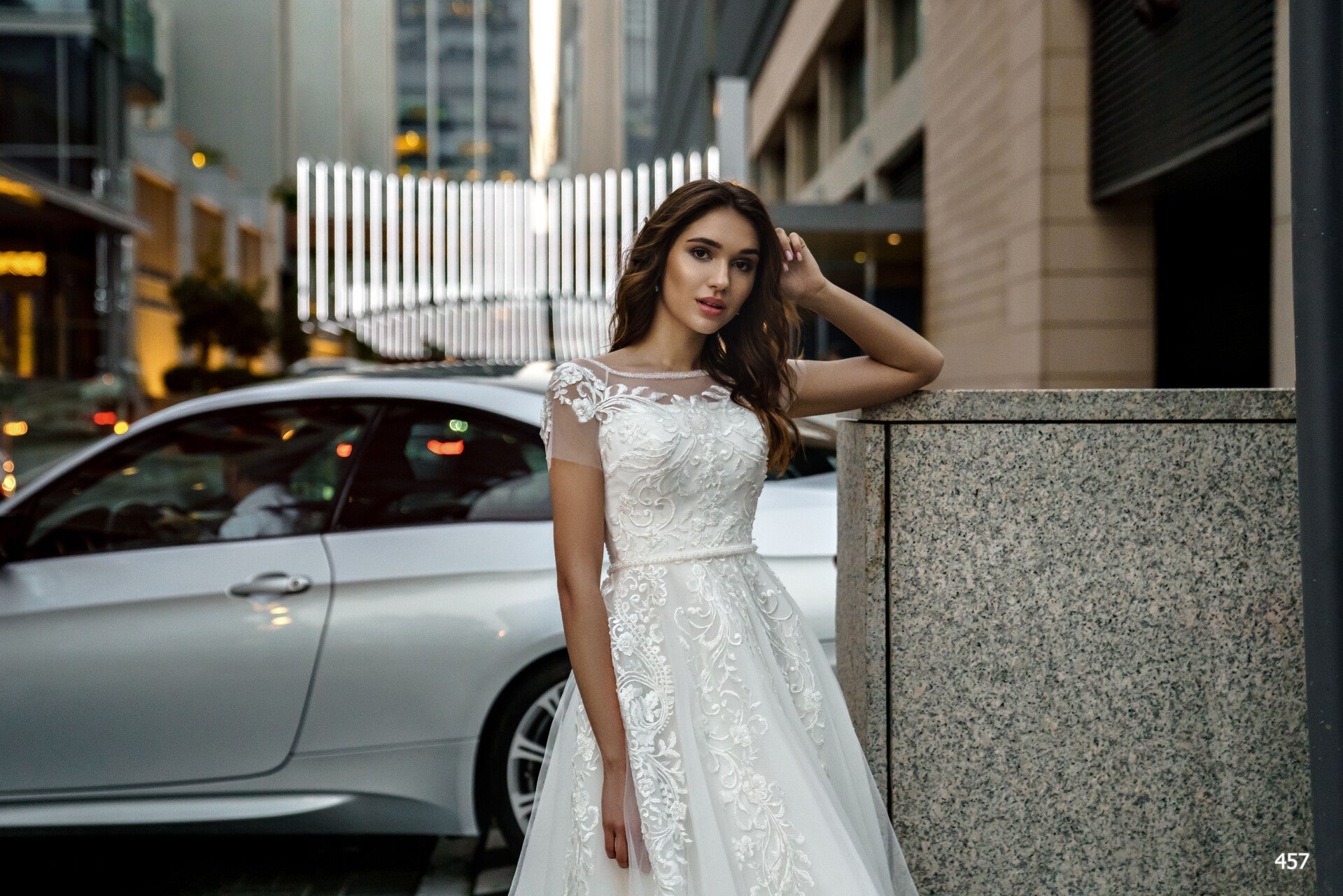 An exquisite voluminous wedding dress. The corset, with a sweetheart neckline, is made of guipure and satin and delicately adorned with sequins and shimmering crystals. A thin belt is placed at the waist. The guipure expands towards the bottom, resembling lace and appliques on the skirt with a train. The back is buttoned.
