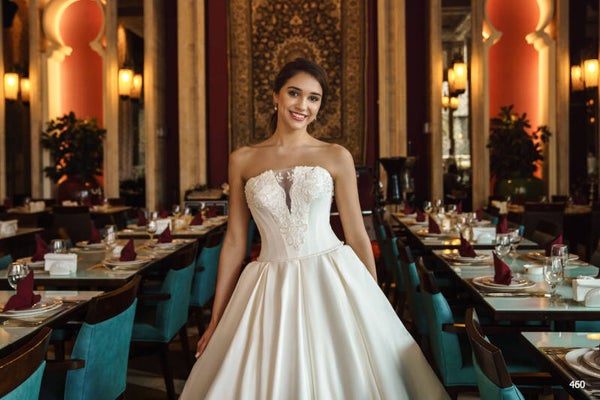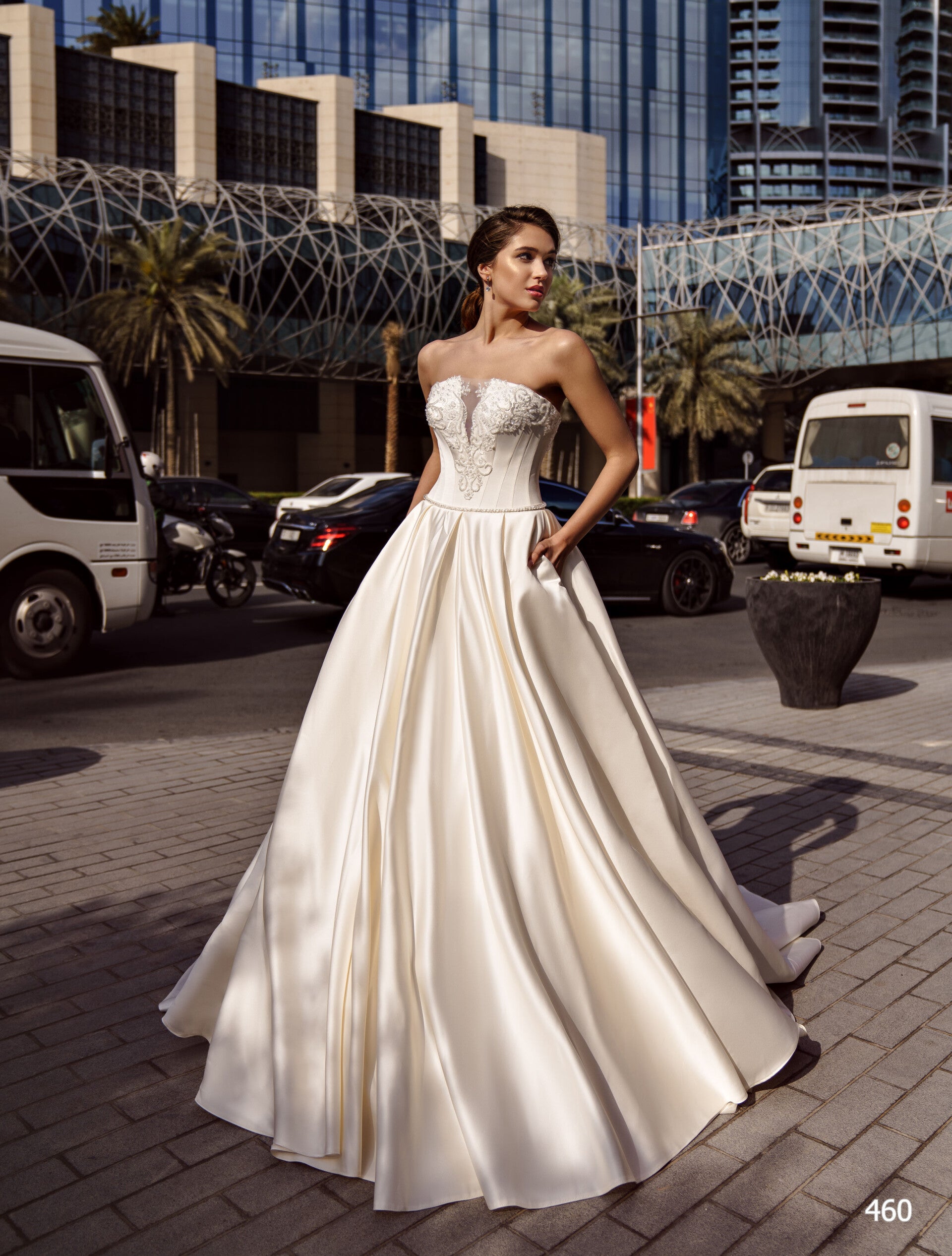 A luxurious satin wedding dress wholesale with a "princess" silhouette and an original bustier corset, elegantly embellished with beads and crystals, which form a beautiful pattern in the triangular area of the chest. The model also features a full pleated skirt with a train, and the back of the corset is tightened with lacing.