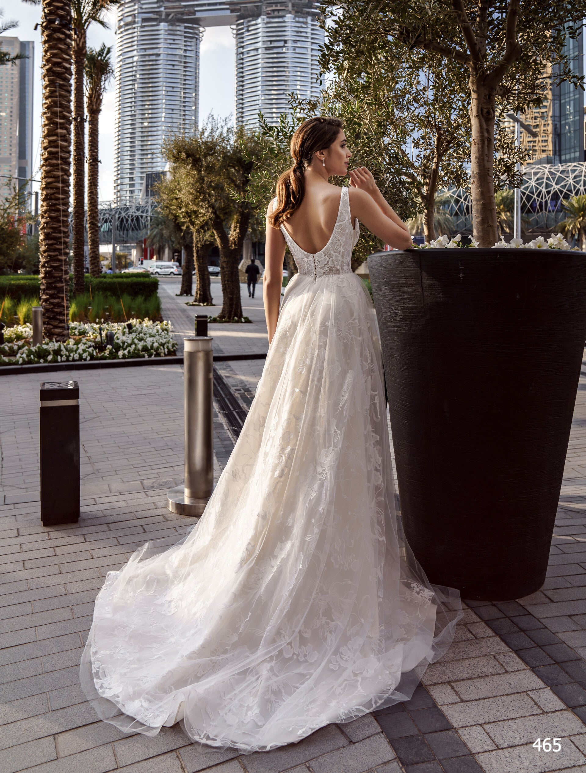 This beautiful A-line wedding dress features a combination of Euro mesh, shantilly, and lace for the corset, adorned with lace and crystals for the perfect amount of sparkle. The V-neckline and cap sleeves add a touch of elegance, while the button back and crystal embellished straps add a delicate detail to the dress. The skirt is made of euro tulle and lace, with a 30 cm train that adds a dramatic effect to your walk down the aisle. The crystal belt accentuates the waistline, creating a flattering and feminine silhouette.