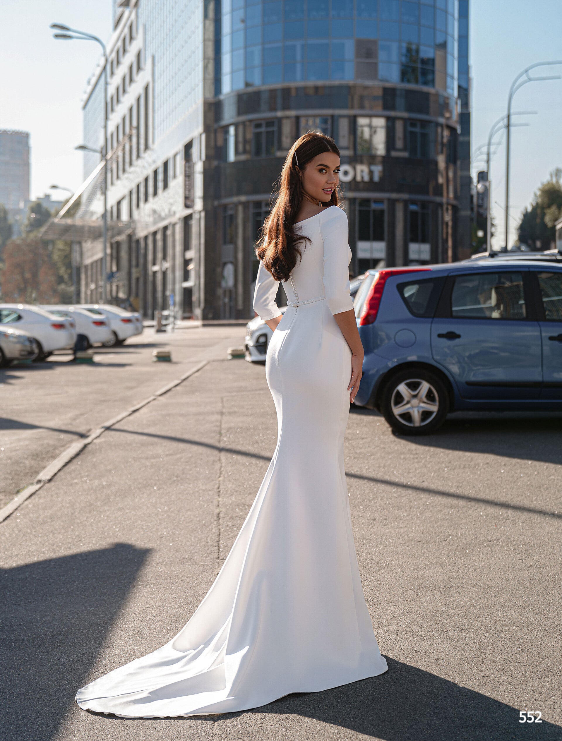 A minimalist wedding dress with 3/4 sleeves and a Swarovski crystal and pearl belt. The dress itself is made of 'Double Soft' satin.
