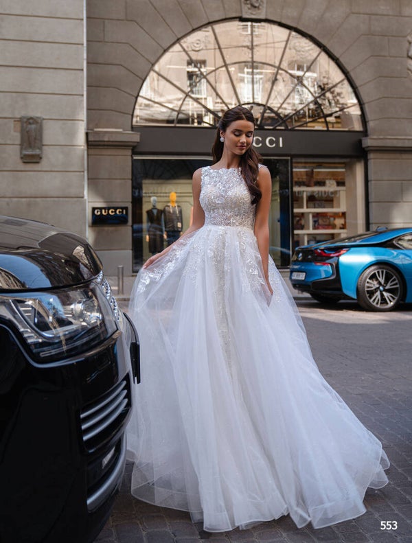 A charming princess-style wedding dress. The sparkling corset and skirt are adorned with lace appliques made of beads and sequins, and elegant buttons at the back.
