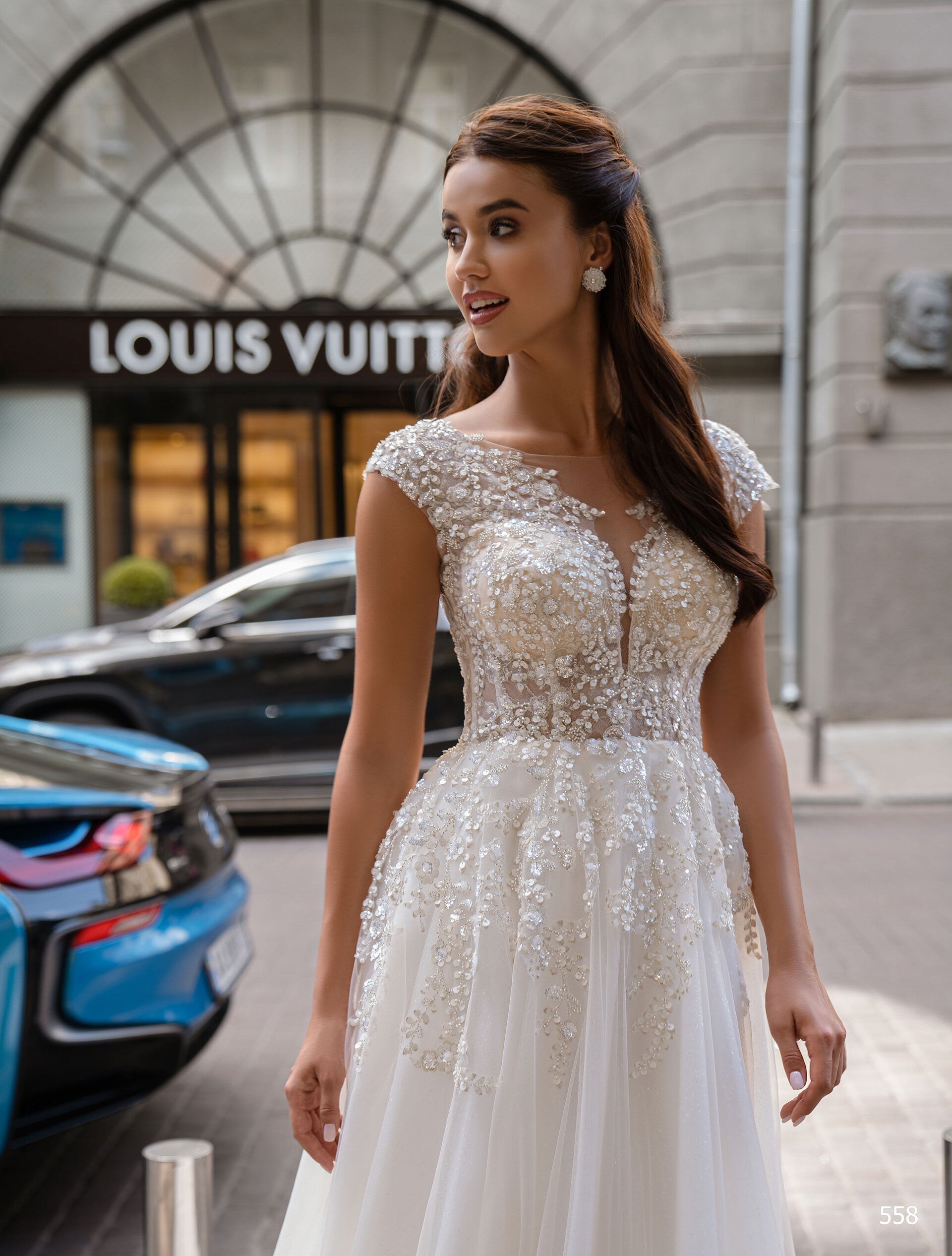 A dress that deserves attention! The Princess wedding dress is a combination of unique appliques with beads, sequins, and sparkling tulle. It features a V-neckline and a beautiful skirt with a train.