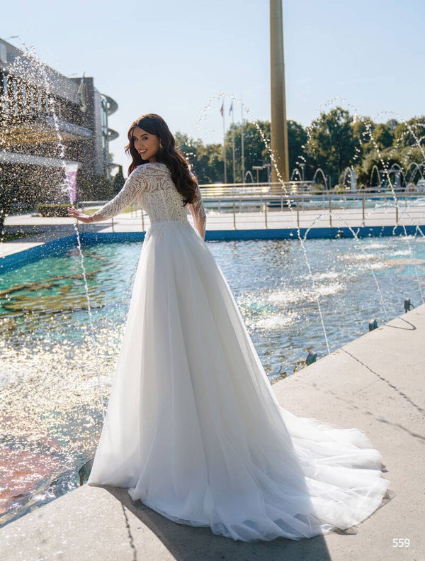 A fairytale A-line princess dress with an attractive corset and long sleeves. The corset is made of Chantilly lace and organza, decorated with embroidered lace and beads, and paired with a simple, lightweight tulle skirt with a train.