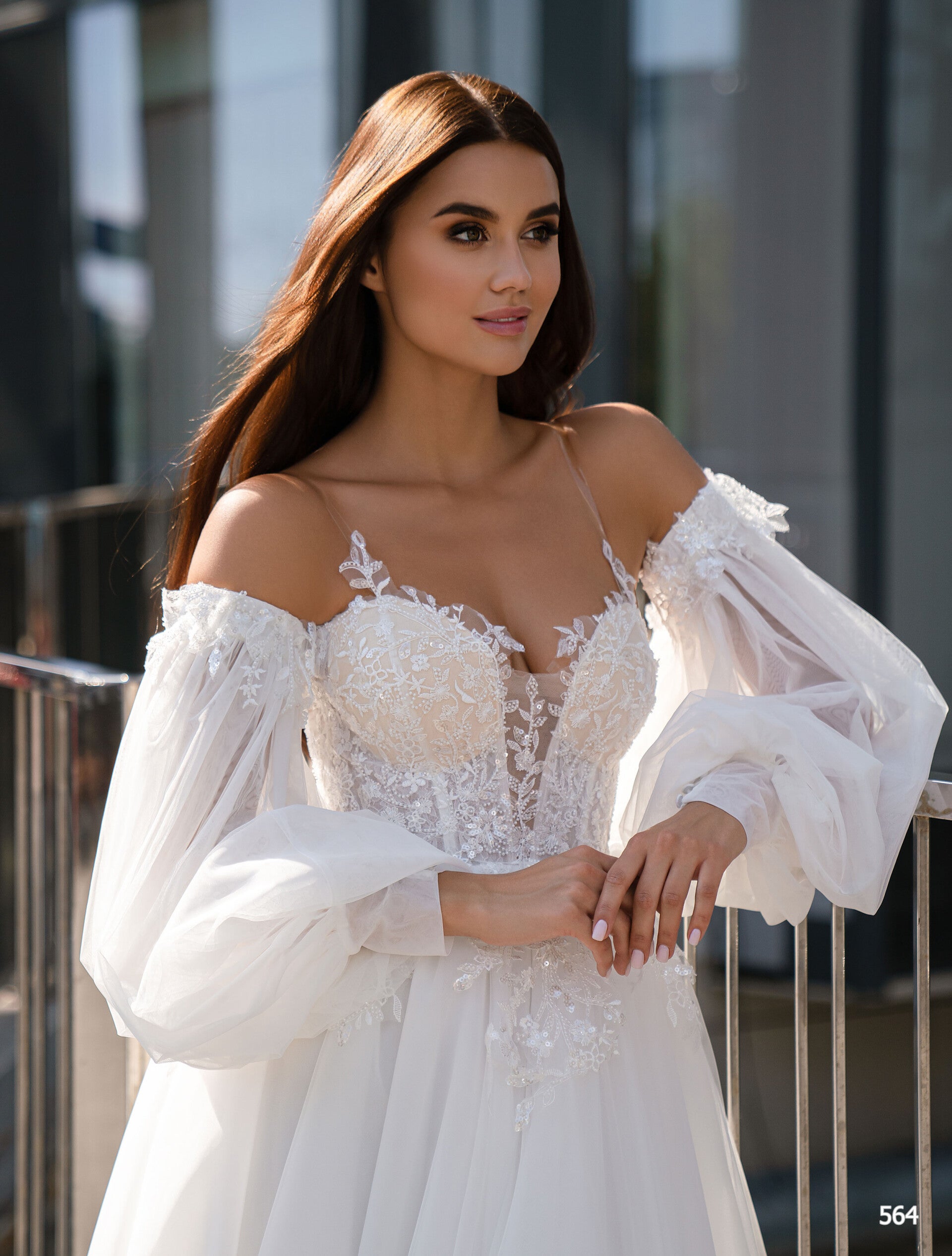 A stunning wedding dress with detachable "puffy" sleeves and a V-neckline on the corset made of shantilly and organza, decorated with lace embroidery with sequins and a voluminous skirt with a train.