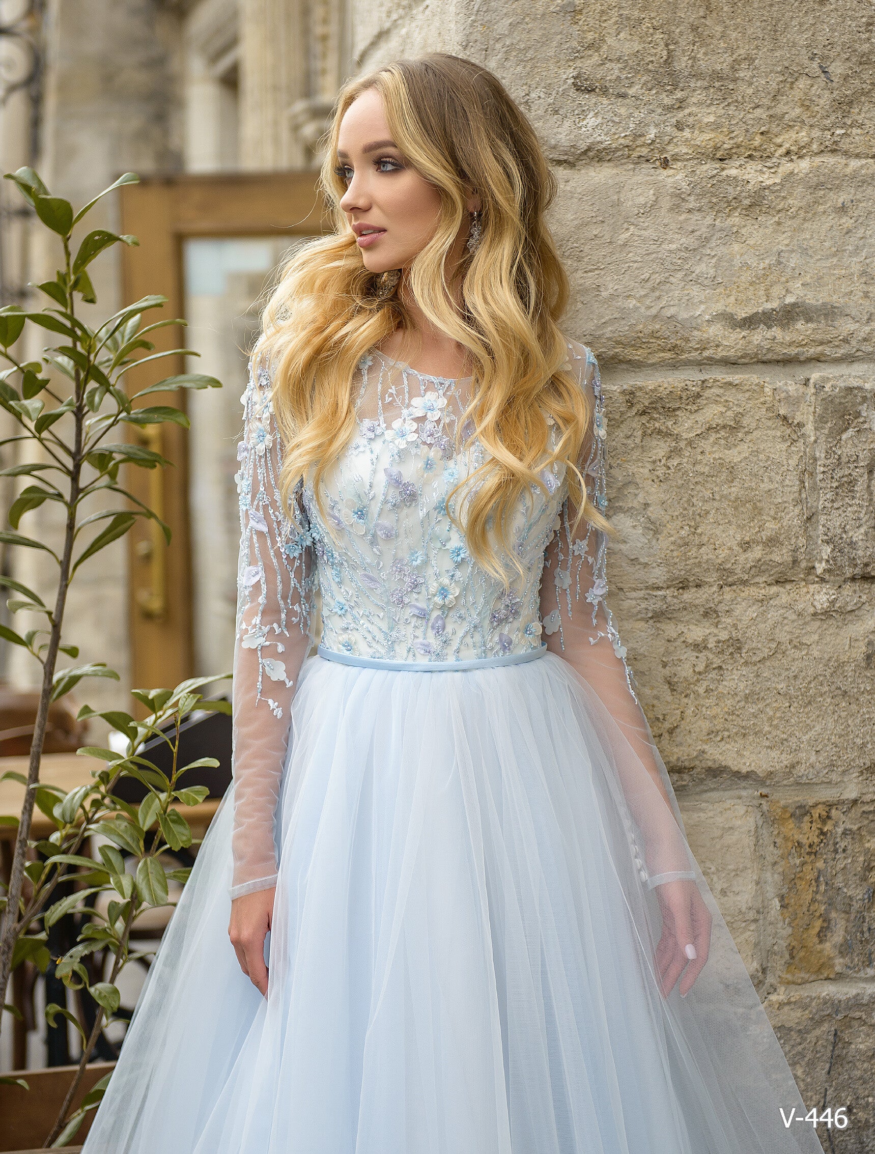 Feminine and delicate evening dresses with long sleeves and a full skirt to the ankles, Regilin at the edges of the skirt creates lush waves and adds volume. The dense "semi-heart" corset is covered with a mesh that is decorated with original volumetric appliques and has a round neckline. On the back - button closure. The waist is framed by a thin contrasting belt. Such lush models look exquisite and romantic.