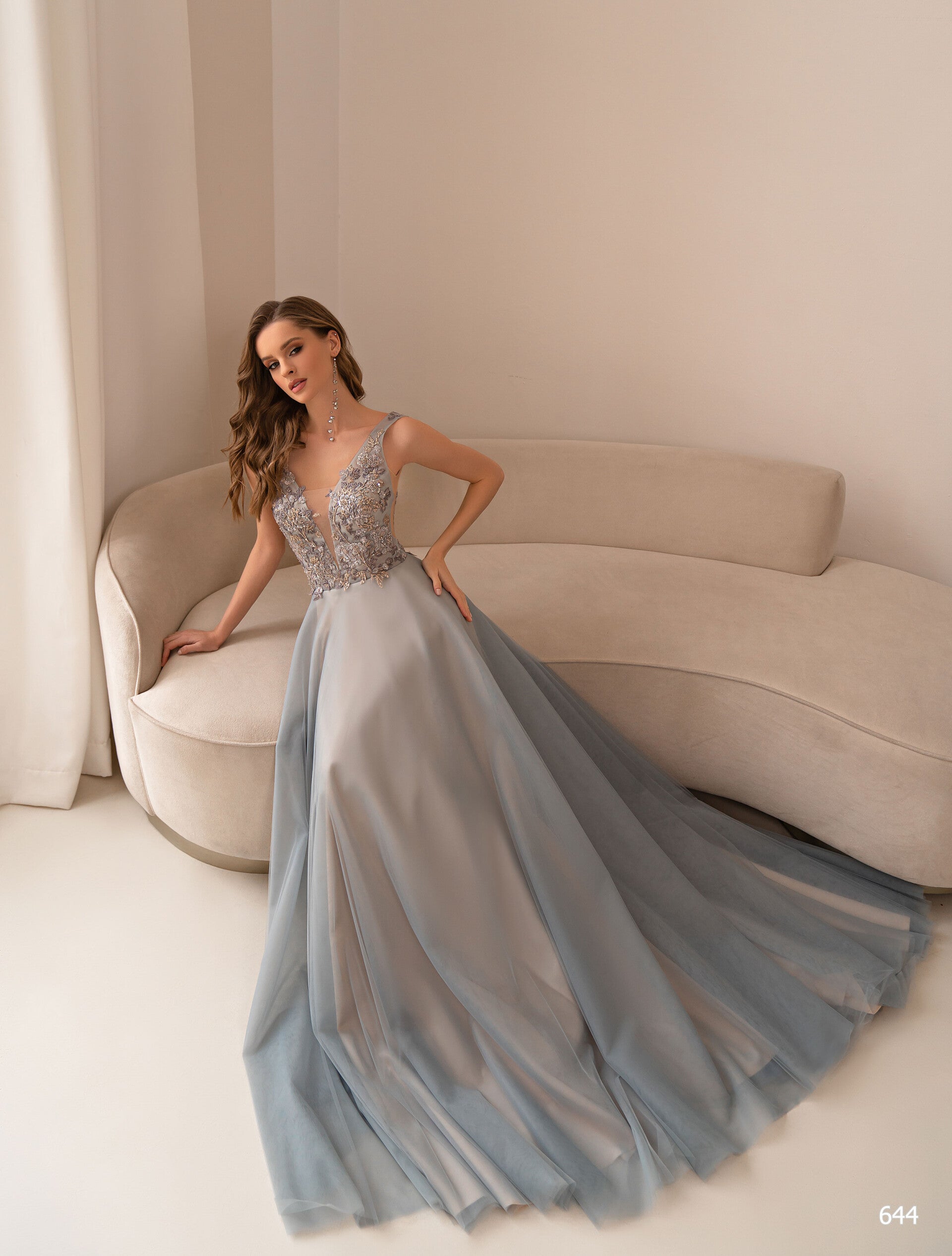Delicate evening dress with a V-neckline both in the front and back, and a trailing A-line skirt.
