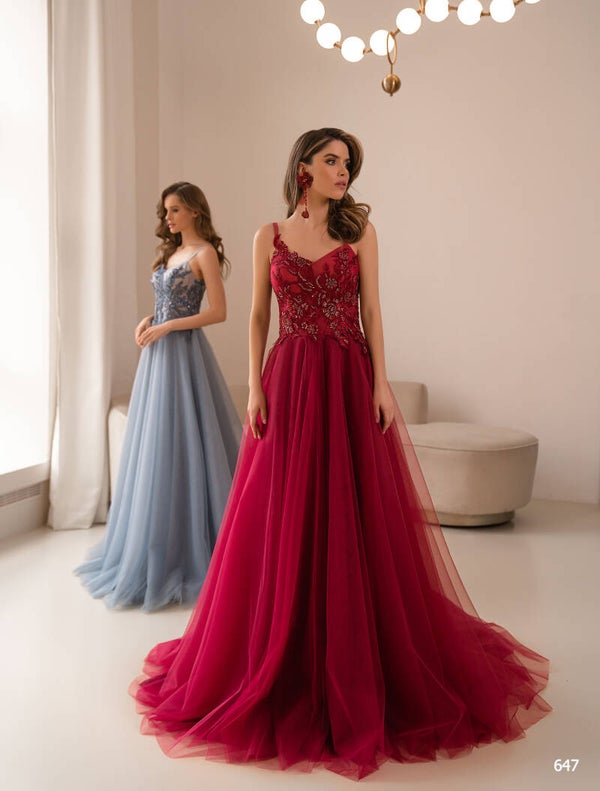 Magnificent A-line evening gown with an attractive bodice adorned with embroidered lace, beads, and sequins.