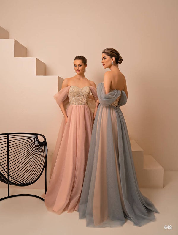 The skirt is made of thin, light and airy tulle with a train, completing the ethereal look.