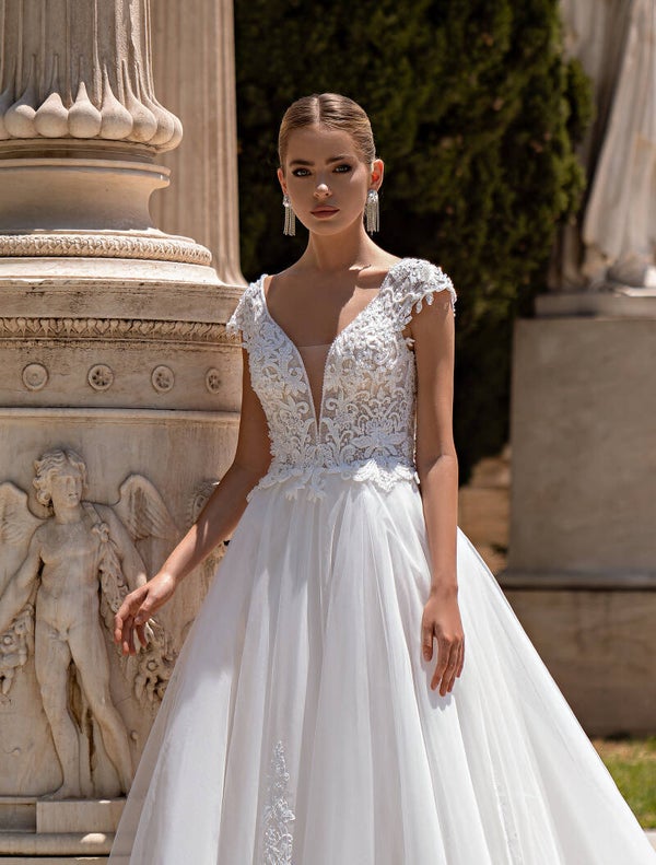 Princess wedding gown with removable volume sleeves with buttons! Corset from organza, lace with sequins decorated with hand-tailored appliques with Swarovski crystals.