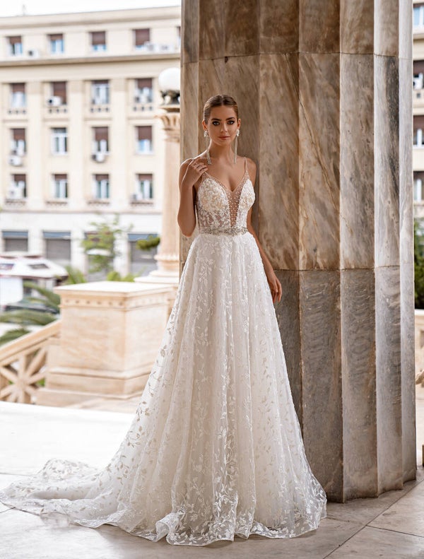 A spectacular A – line wedding gown with nude color corset with V – neckline. The whole dress is made of from beaded embroidery guipure, decorated by hand tailored sequins and beads. The belt from pearls, stones and beads with pony tail at the back.