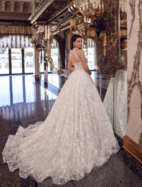The skirt is crafted from tulle and adorned with sequin ornaments, creating a rich and voluminous train.