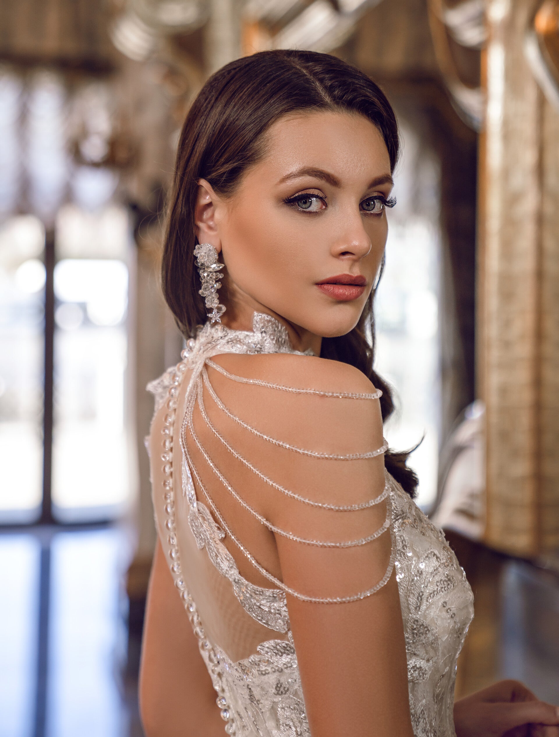 The timeless allure of a high halter neckline, encrusted with glass beads, beautifully encircles the neck and forms a V-neck bodice.