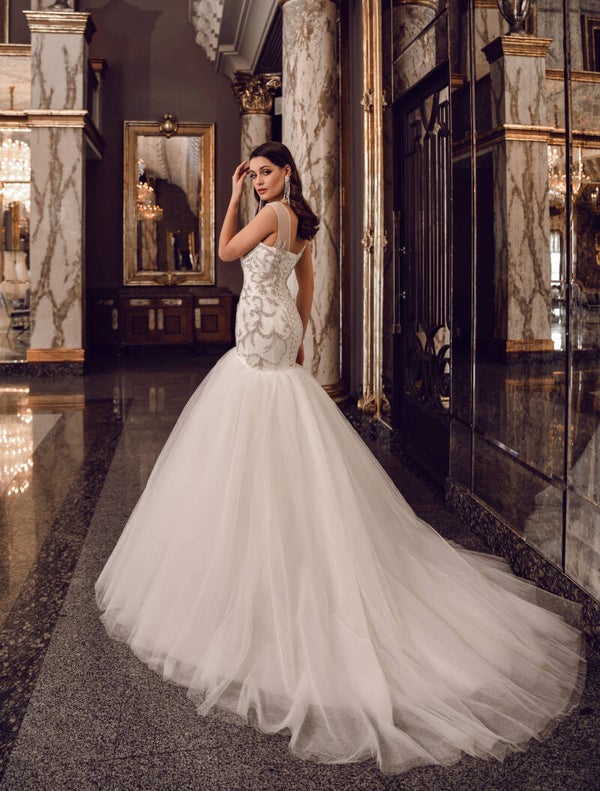 A gorgeous mermaid wedding dress with a V-neck paired with a floor-sweeping skirt made of the softest layered tulle.