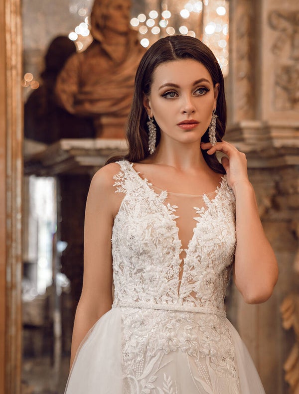 A luxurious wedding dress in the "godet" style, with straps and a removable train.