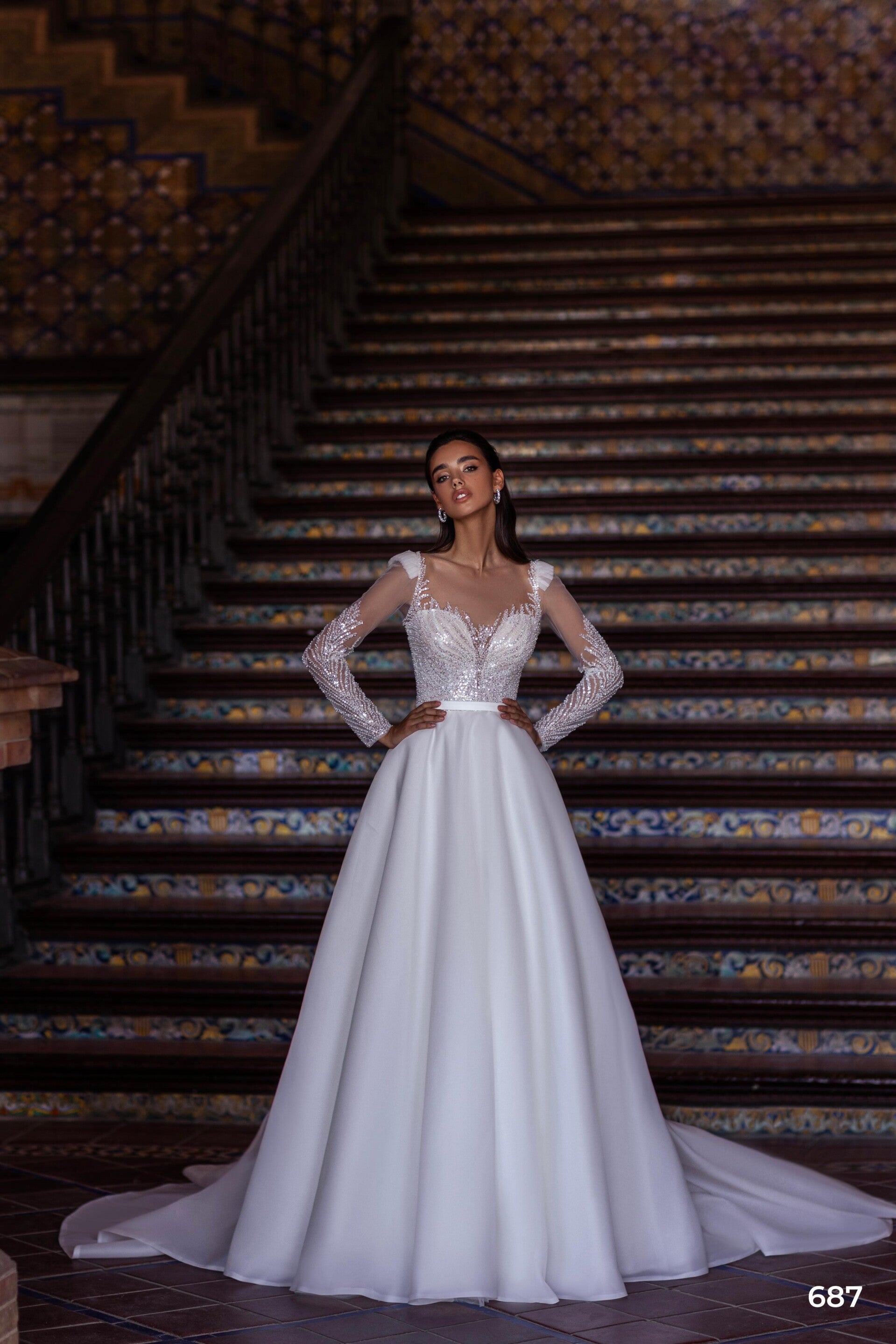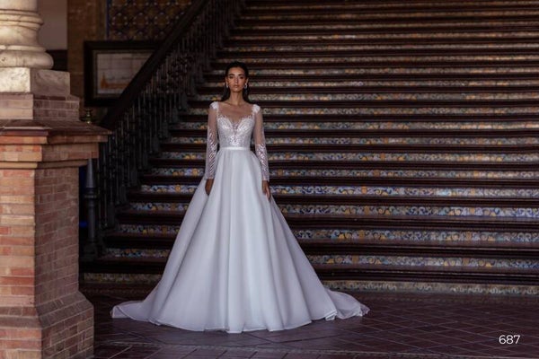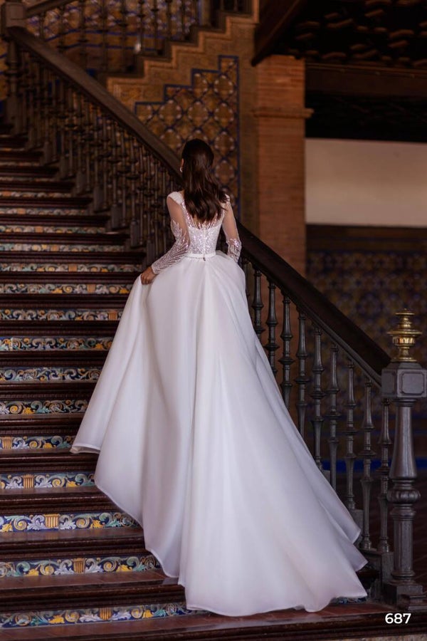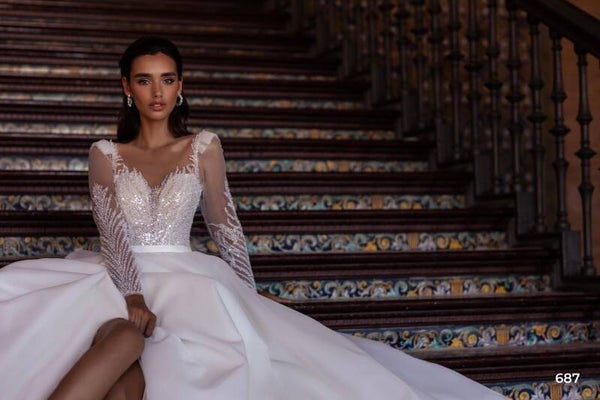 A magnificent princess-style wedding dress with rich guipure, embroidered with various pearls, sequins, and beads. The luxurious matte skirt is made of voile (matte organza). The look is complemented by a detachable voile belt. The train is 50 cm.