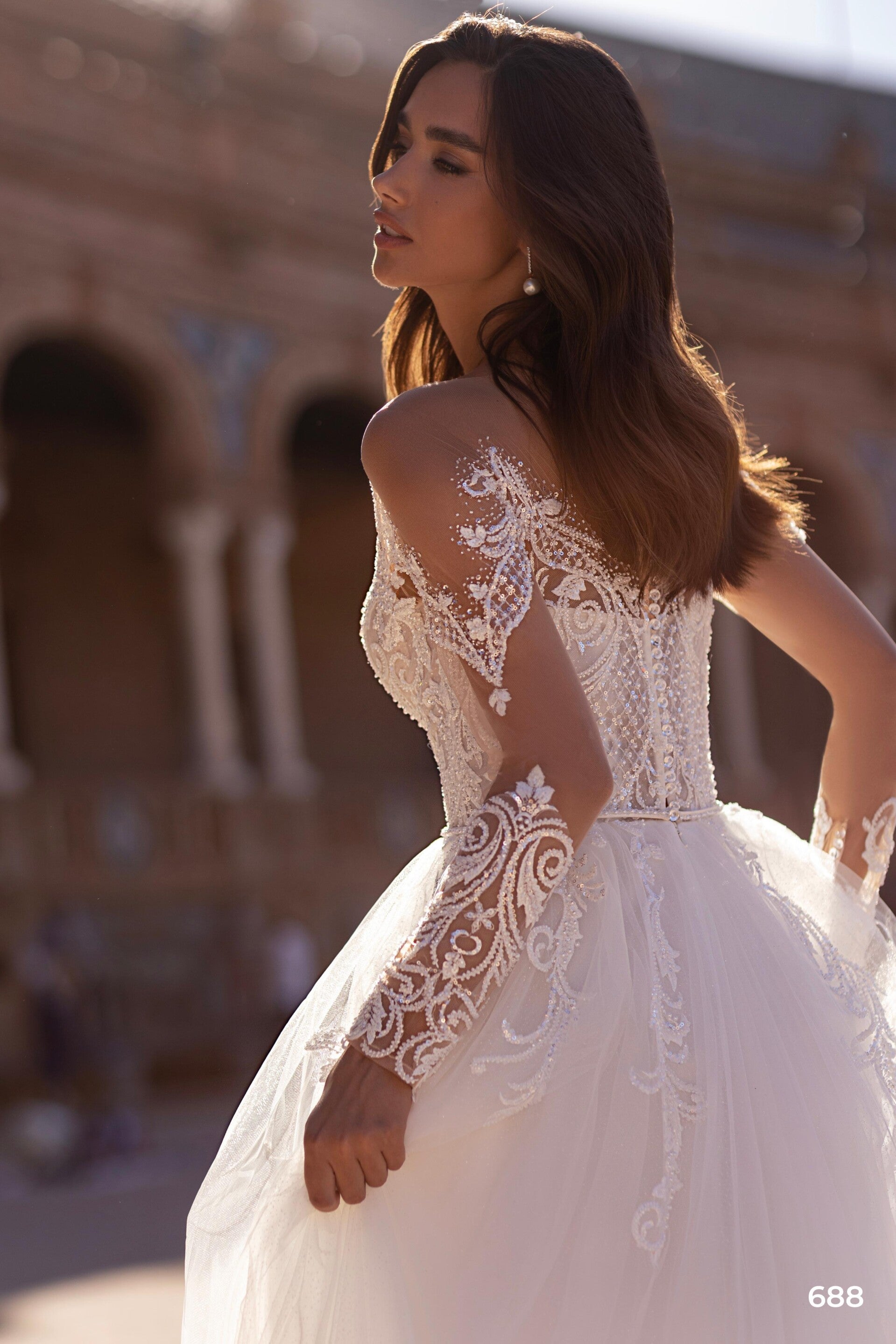 A lavish and sparkling wedding dress. The corset and sleeves are adorned with embroidered guipure made of beads and sequins, which gracefully descends onto the skirt. The belt is embroidered with pearls and crystals. The skirt is made of tulle, with a subtle shimmer under the first layer, and it comes with a 30 cm train