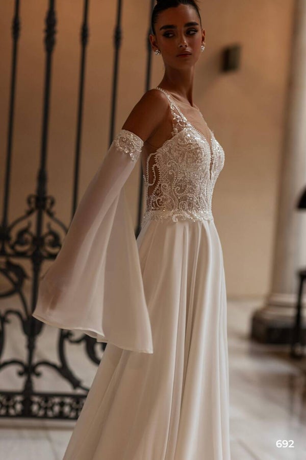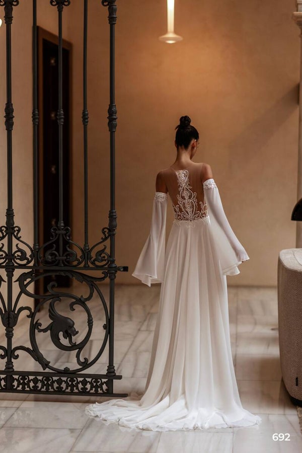 A light, airy dress made of multi-chiffon with removable sleeves adorned with pearls, beads, and sequins. The corset, made of Chantilly lace, features a deep V-neckline embellished with numerous pearls, beads, and sequins. The beautiful semi-transparent back with richly embroidered guipure perfectly completes this look. The skirt comes with a 30 cm train.