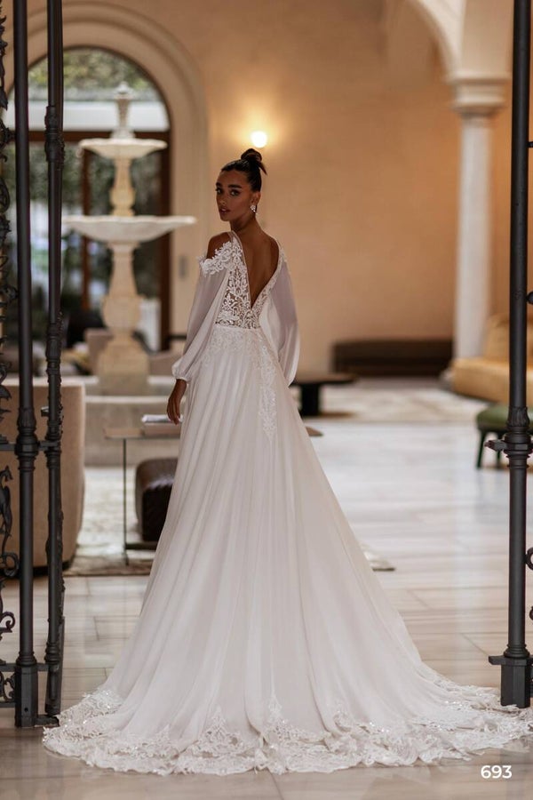An exquisite wedding dress. The corset features a deep V-neckline adorned with embroidered guipure, crystals, beads, sequins, and pearls. The detachable sleeve, made of multi-chiffon, is also embellished. The skirt, crafted from multi-chiffon, comes with a 30 cm train. The open back is adorned with pearls. Additionally, there is a fairy-tale detachable train embellished with sequins.