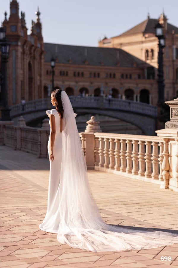 An exquisite mermaid-style dress made of crepe with a luxurious back. The bodice is adorned with embroidered guipure made of beads and sequins. The waist is embellished with crystals.