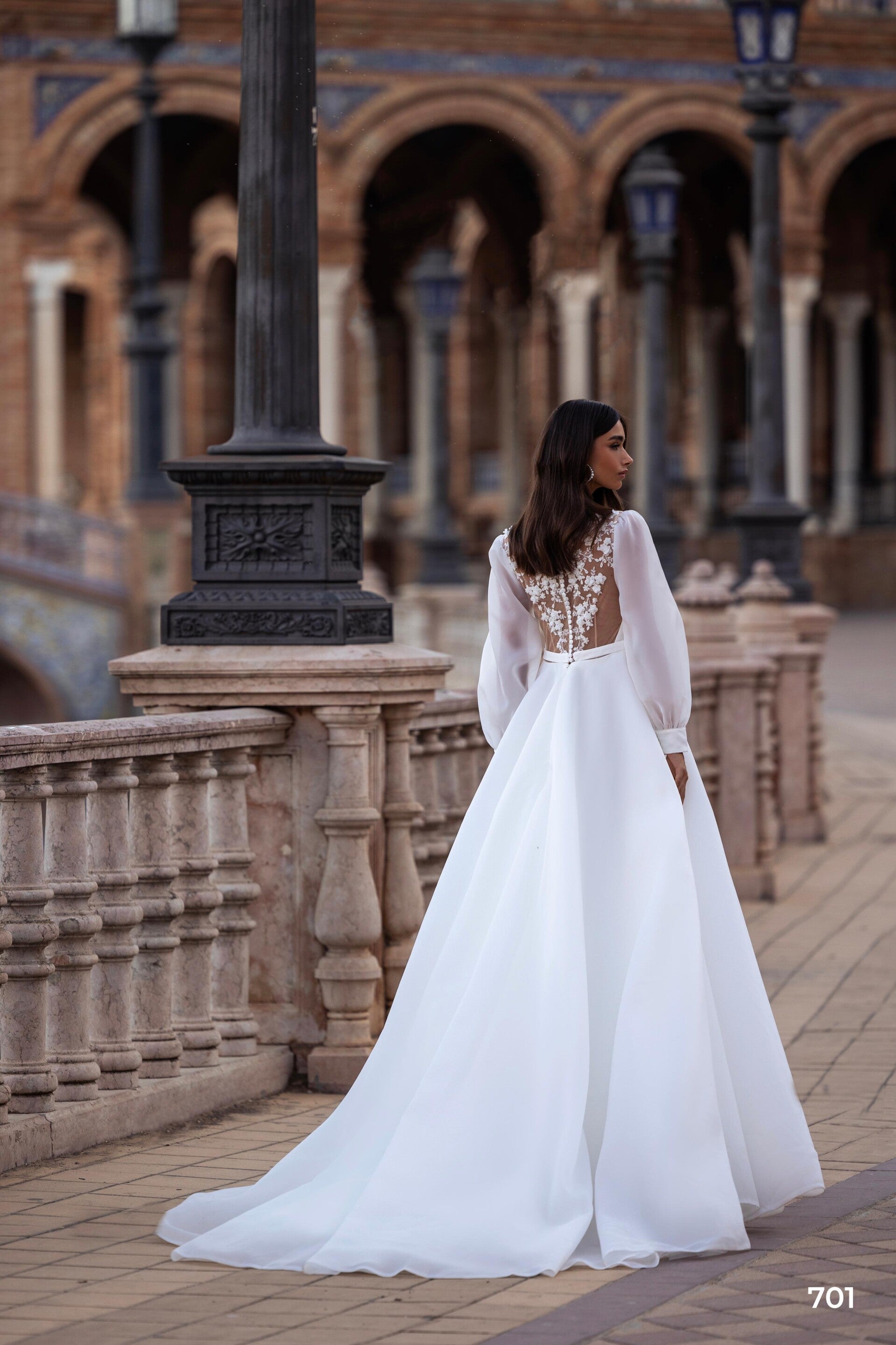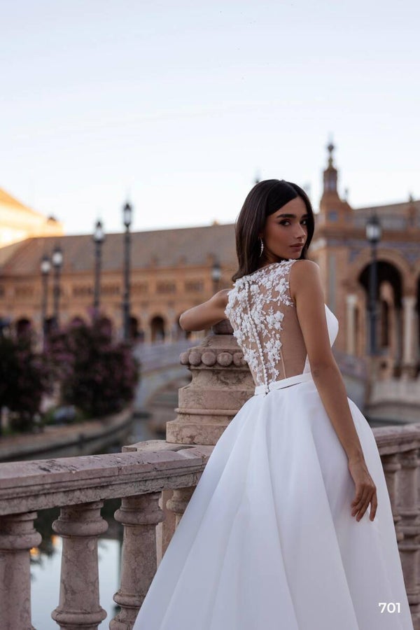 A simple yet enchanting dress made of voile (matte organza) with removable sleeves. The corset is adorned with 3D flowers at the back. The dress also features a removable belt. The A-line silhouette skirt comes with a 50 cm train, and there's a two-tiered veil made of tulle.