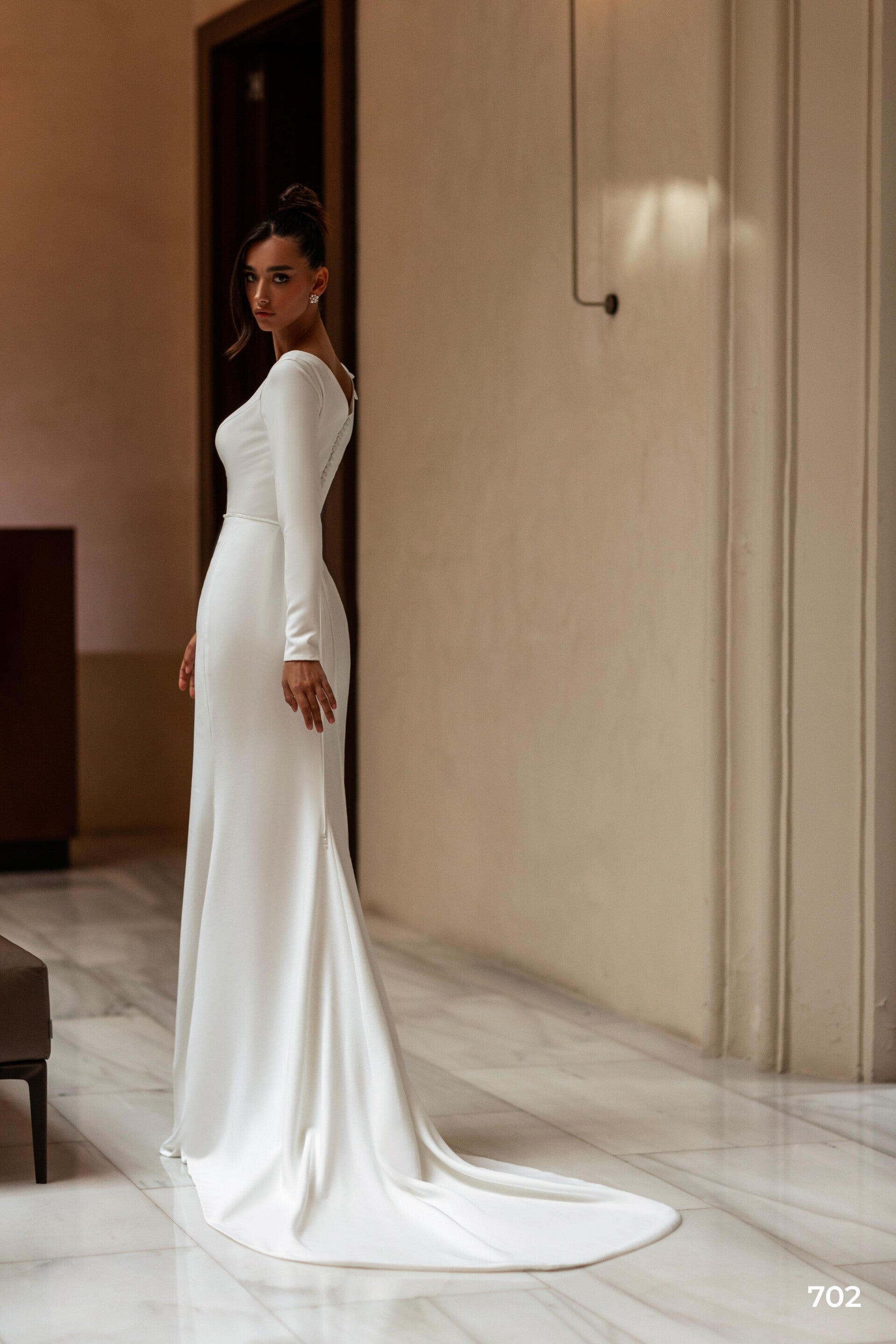 A simple yet elegant wedding dress in the 'mermaid' style made of crepe. The crepe corset is adorned with embroidered beads, crystals, and guipure sequins. The look is complemented by a detachable belt with European lacing, embroidered with crystals.