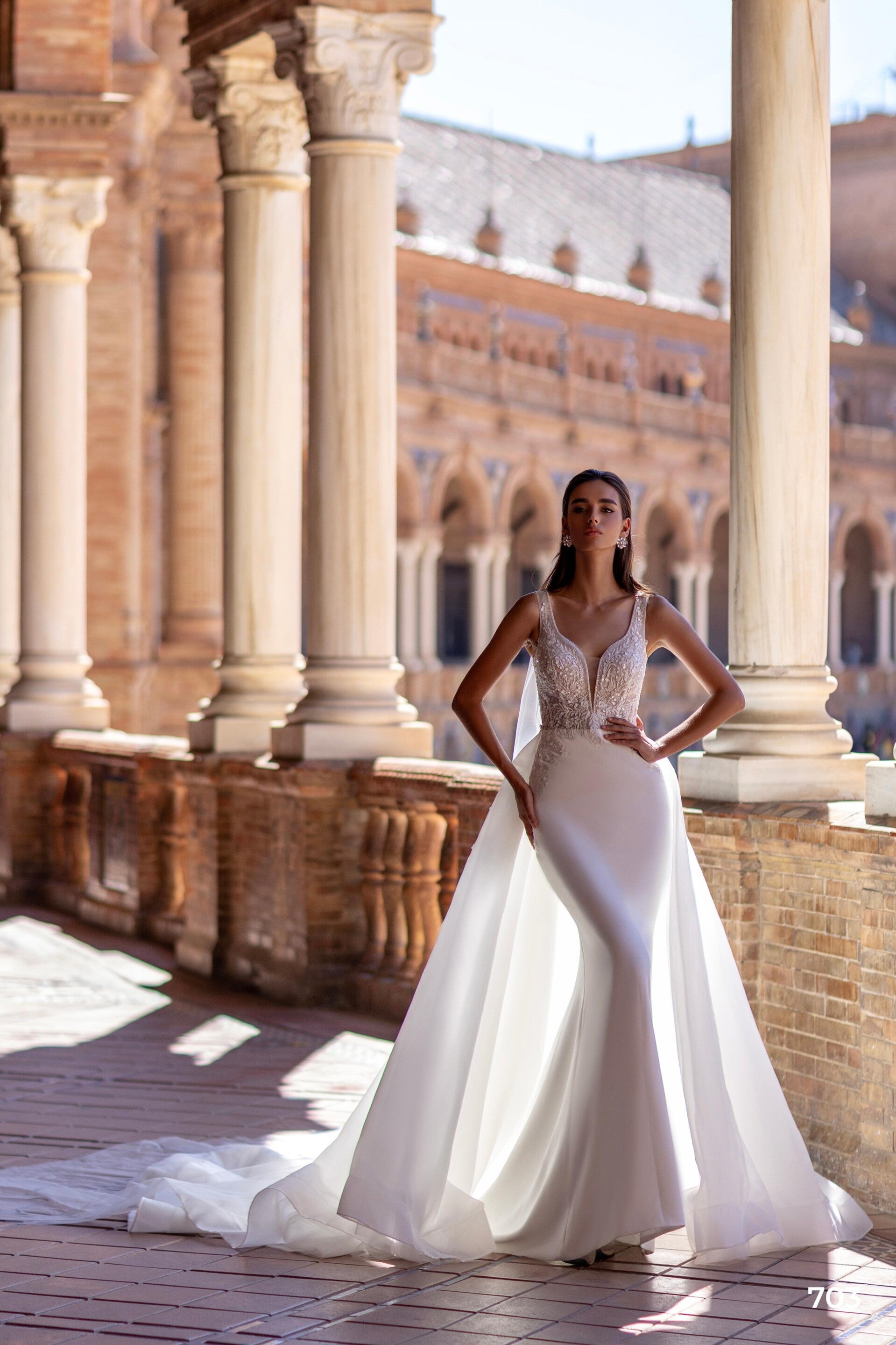 A contemporary mermaid-style dress. The corset is made of European tulle, glitter, and drama, adorned with crystals and beads. The skirt is crafted from crepe. Additionally, there is a detachable 50 cm train made of voile (matte organza), embellished with embroidered guipure made of beads, pearls, and sequins. The belt of the train is adorned with crystals.