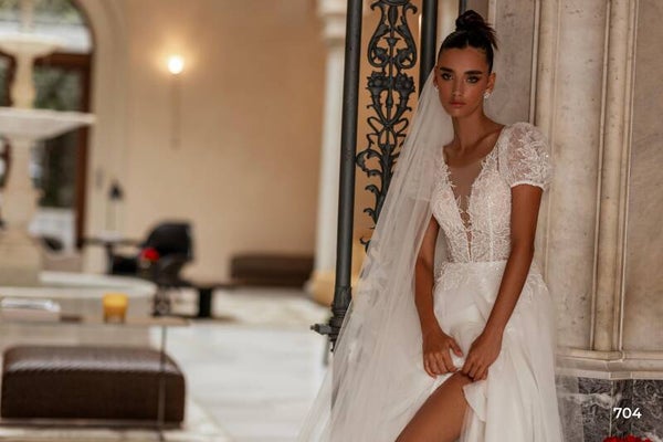 A fairytale wedding dress with a stunning back. The corset is made of guipure with sequins, adorned with embroidered appliques filled with beads that gracefully cascade onto the A-line skirt. Lantern sleeves and a deep V-neck complete this radiant look.