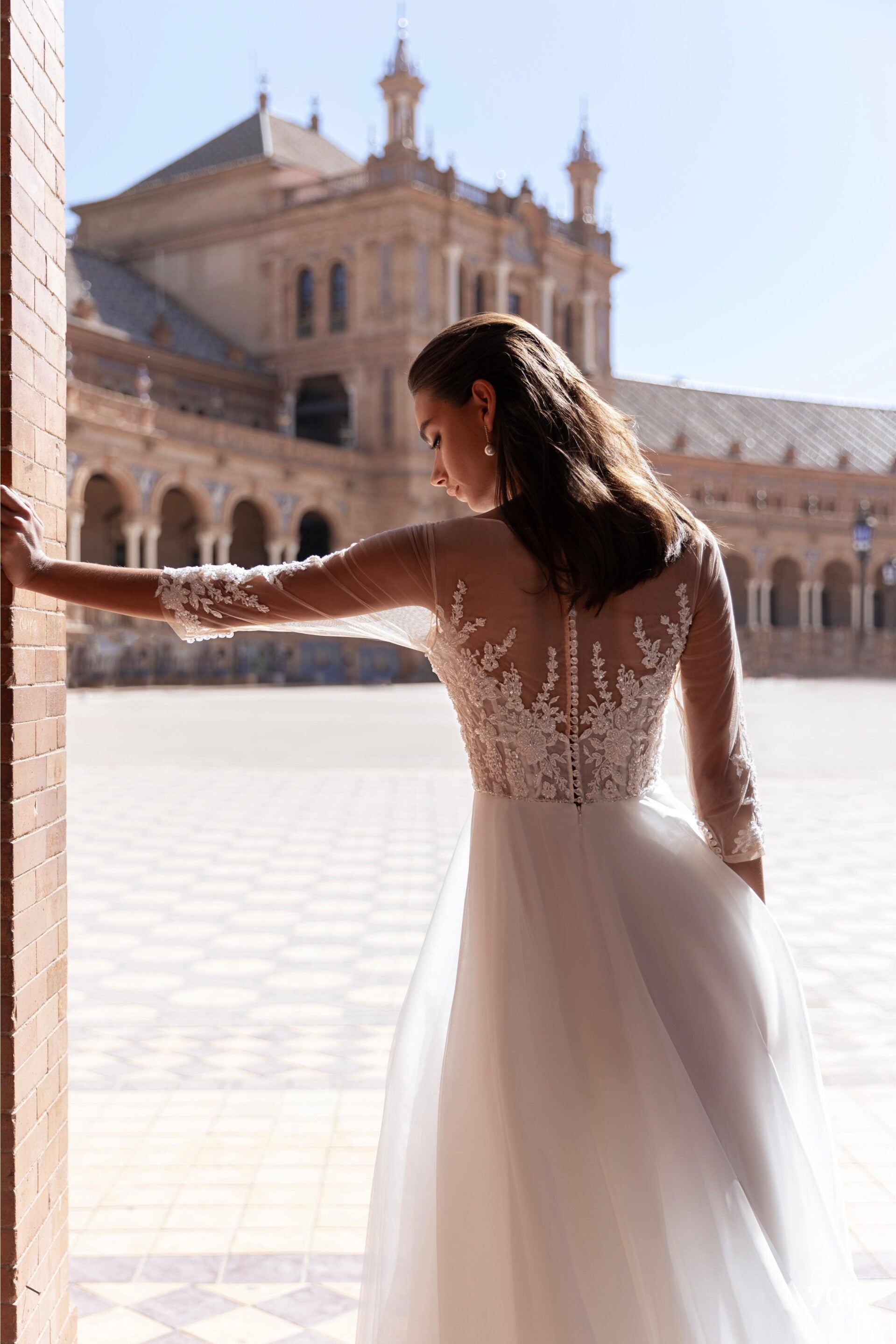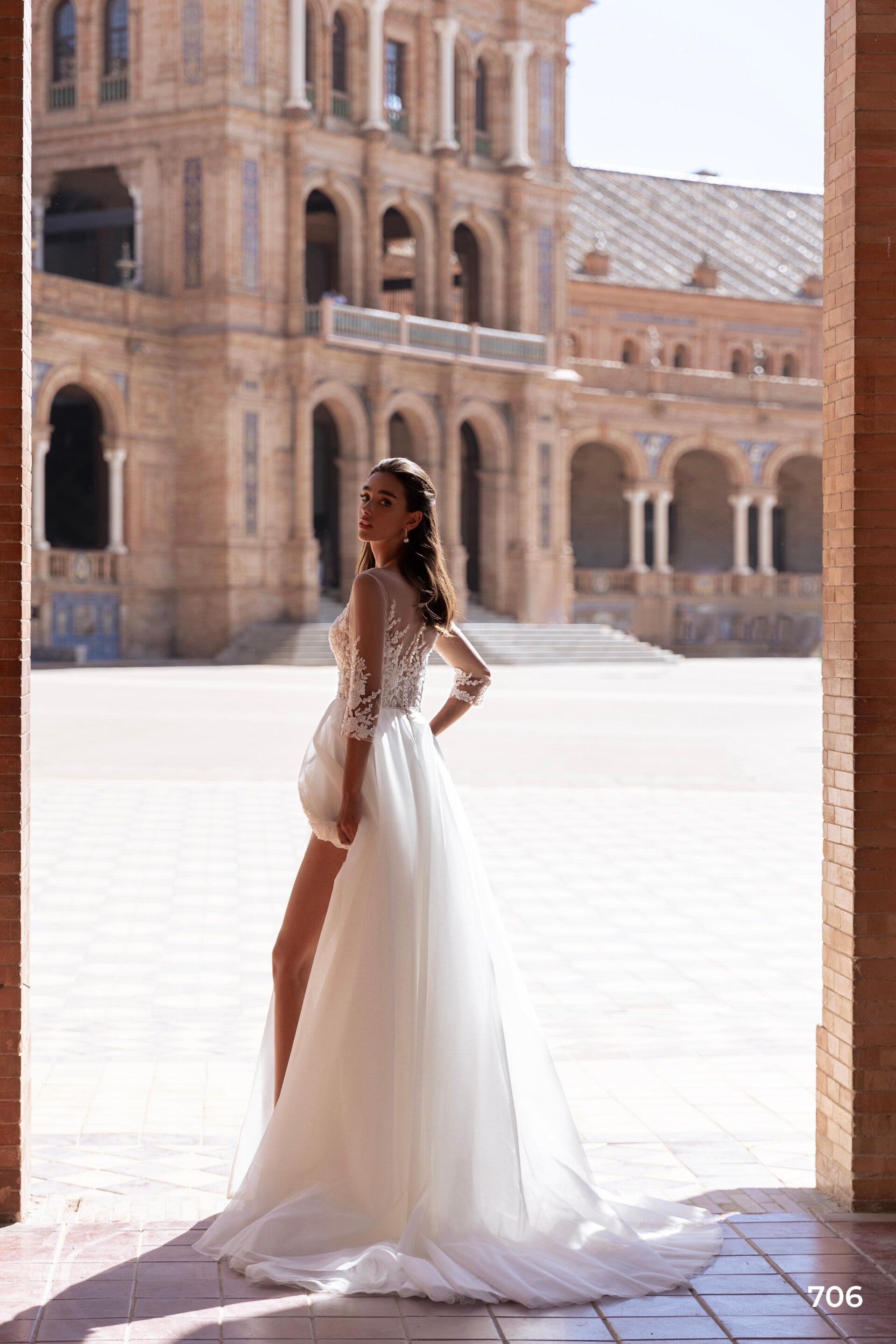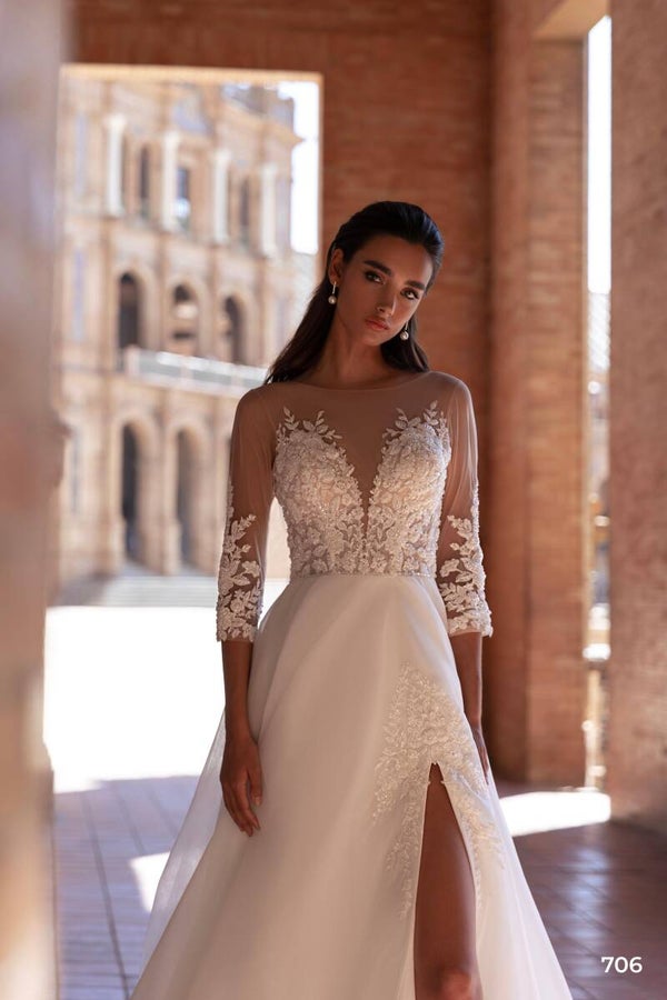 A simple yet elegant wedding dress with a stunning slit. The corset and sleeves are adorned with intricately embroidered guipure made of beads. The skirt is made from dense European tulle, and it comes with a 30 cm train.