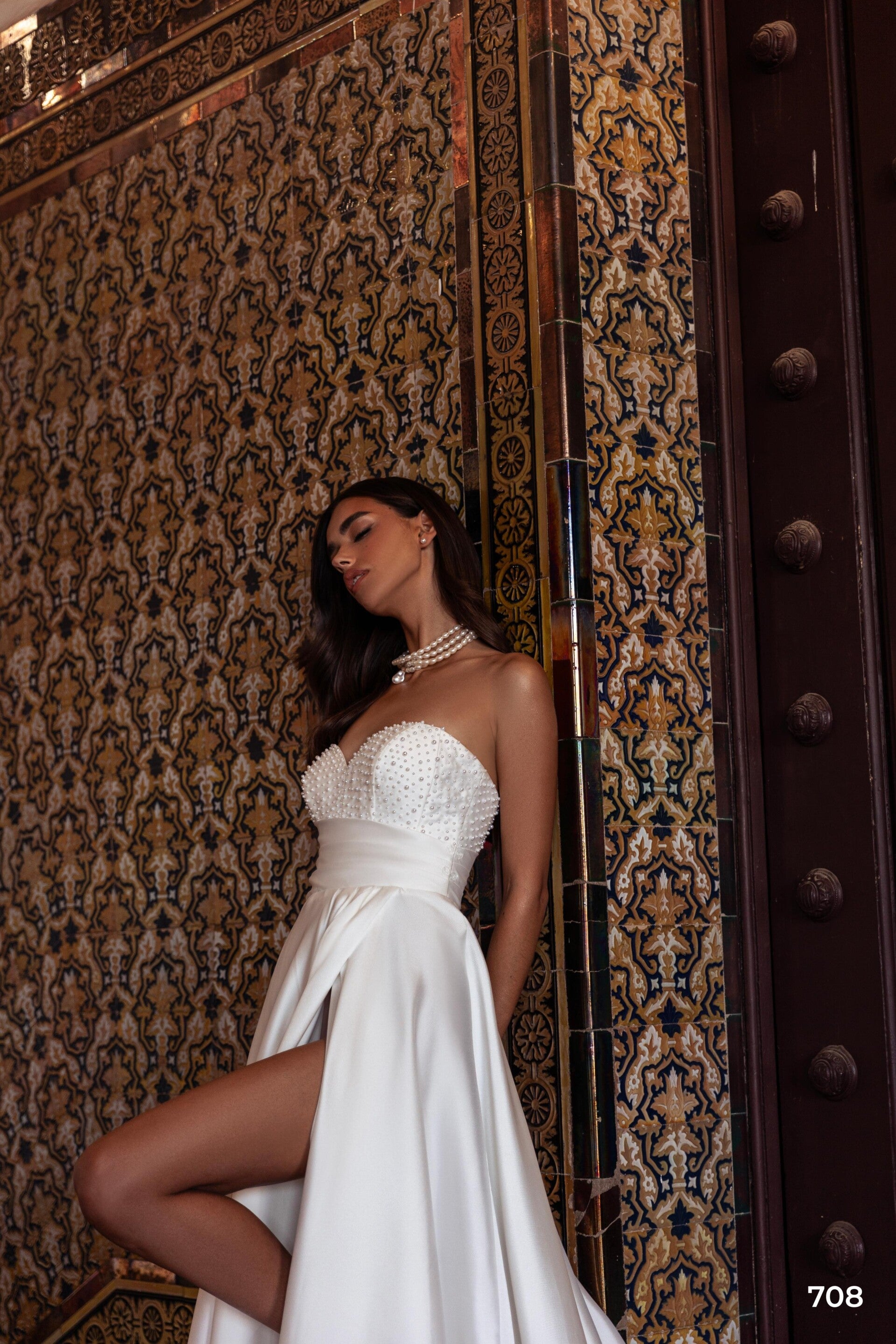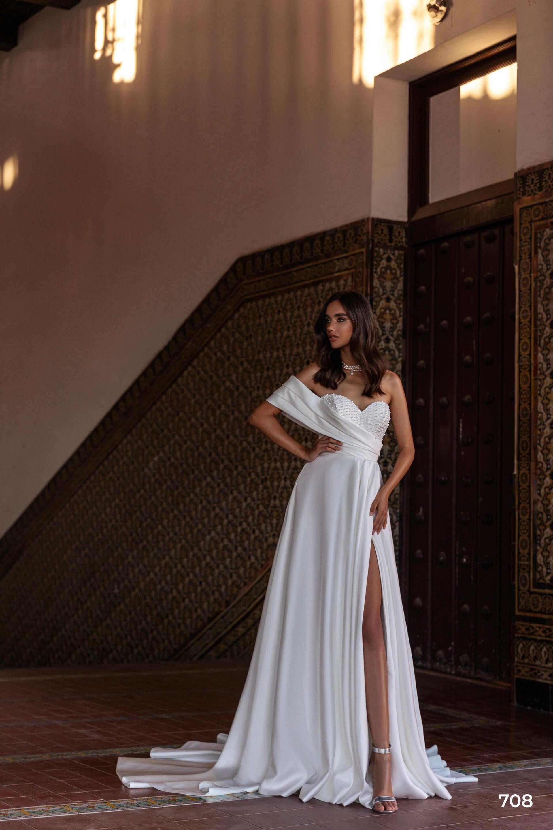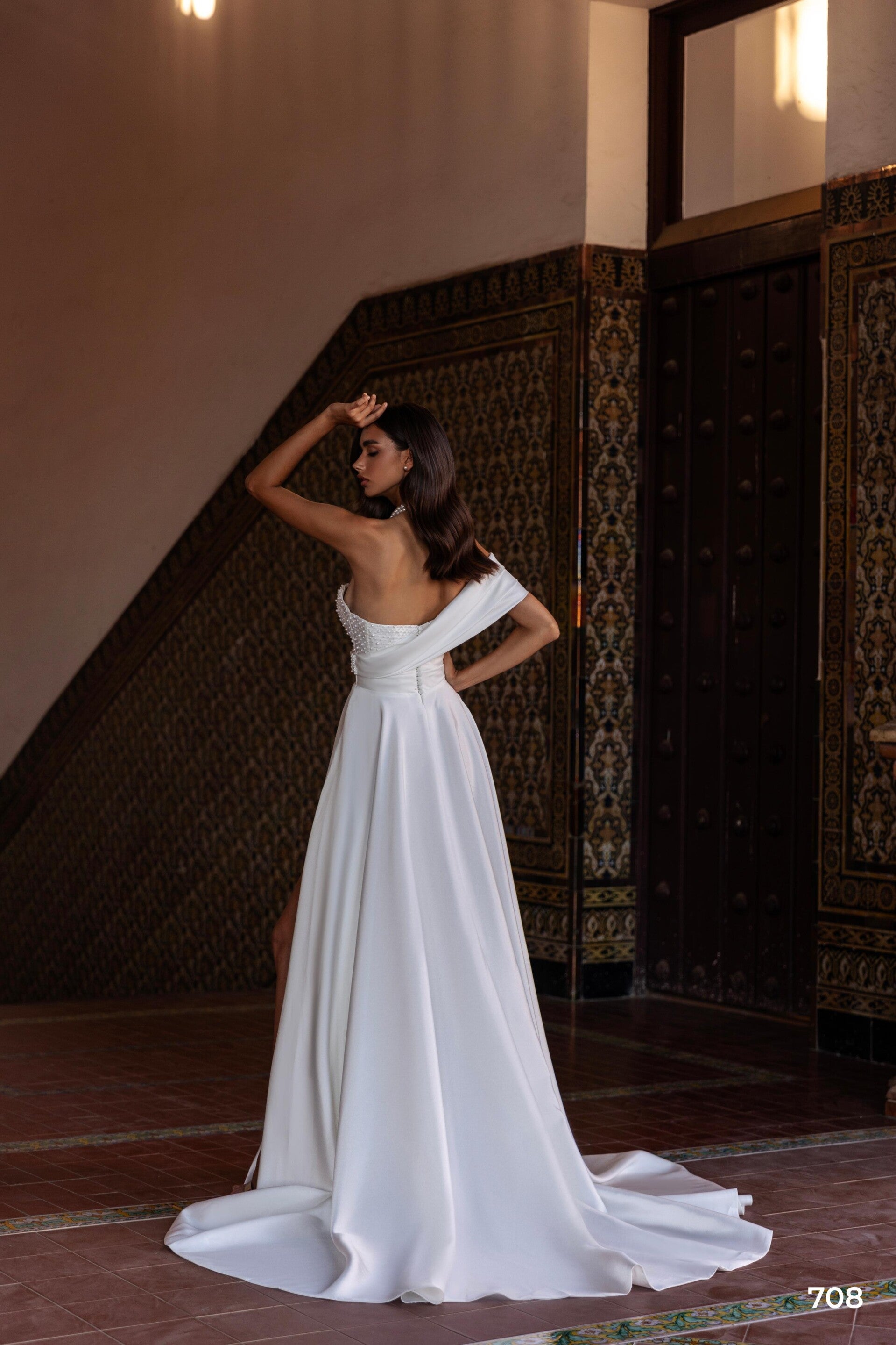 A delicate dress with a draped removable collar made of soft Mikado fabric. The corset is adorned with pearls. The wrap-style skirt, also made of soft Mikado, features a 50 cm train.