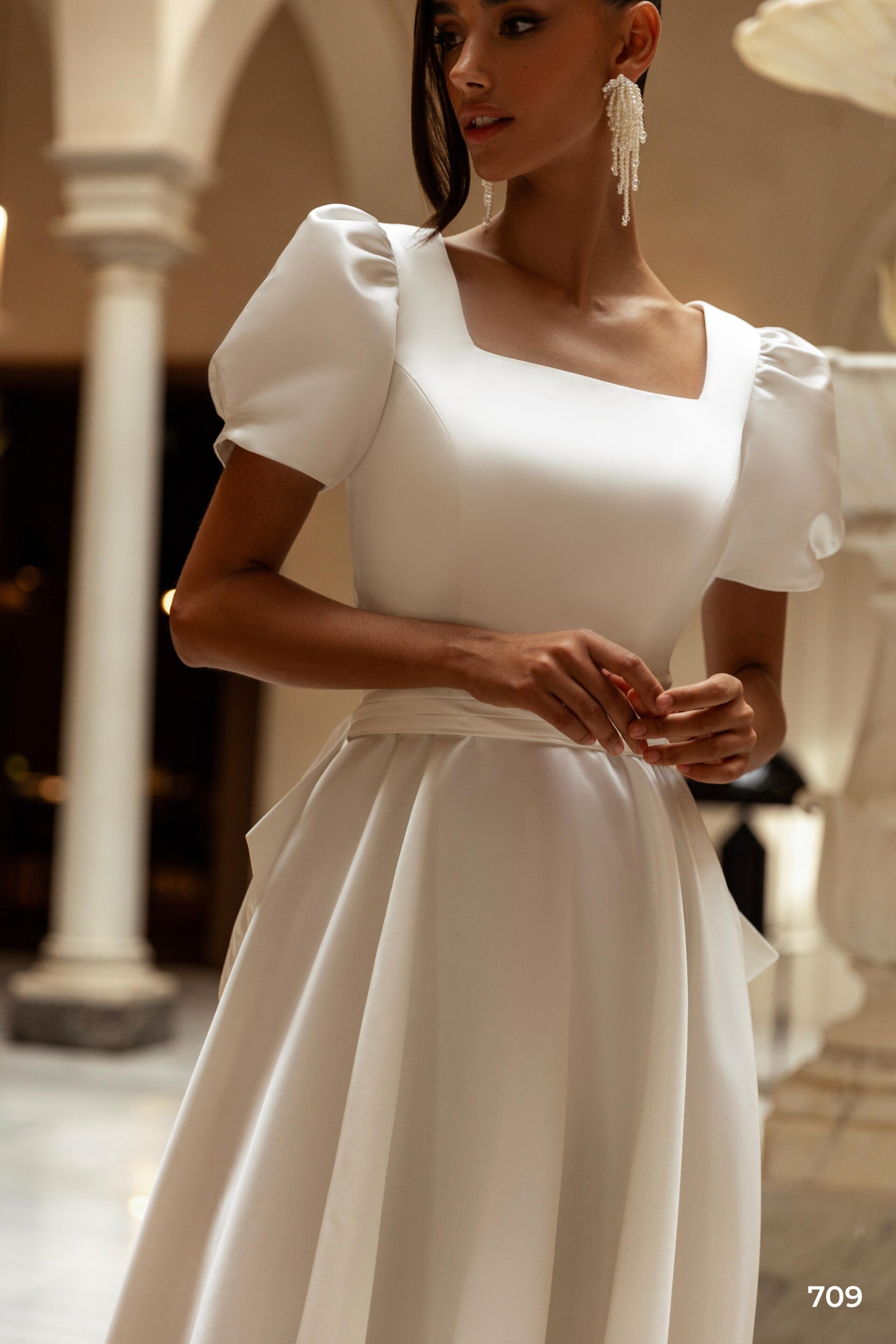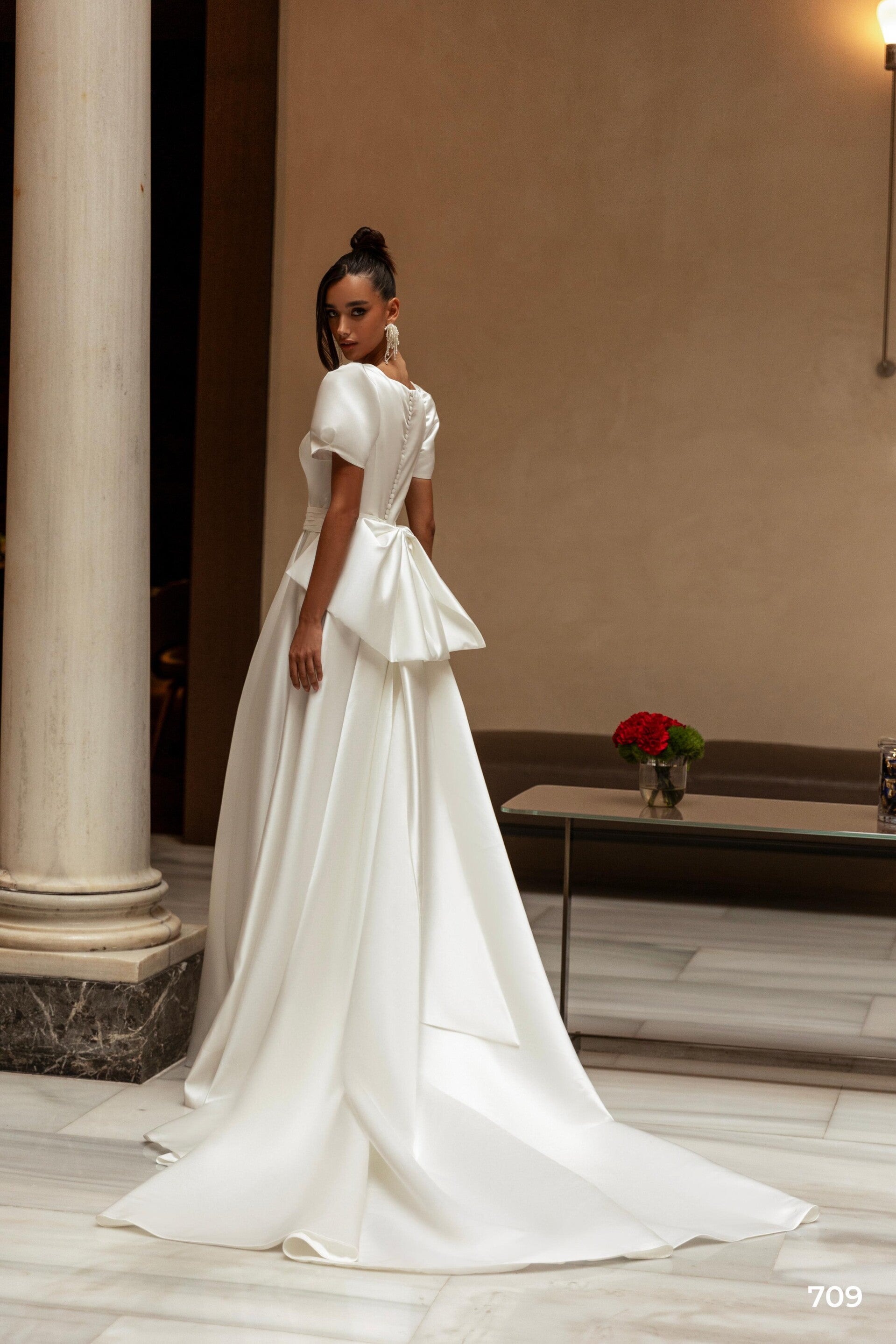 A princess-style dress with a removable bow at the back. The corset and lantern sleeves are made from exquisite Duses satin. The removable draped belt and A-line silhouette skirt with a 50 cm train, all crafted from the same material, beautifully complete this fairytale look.