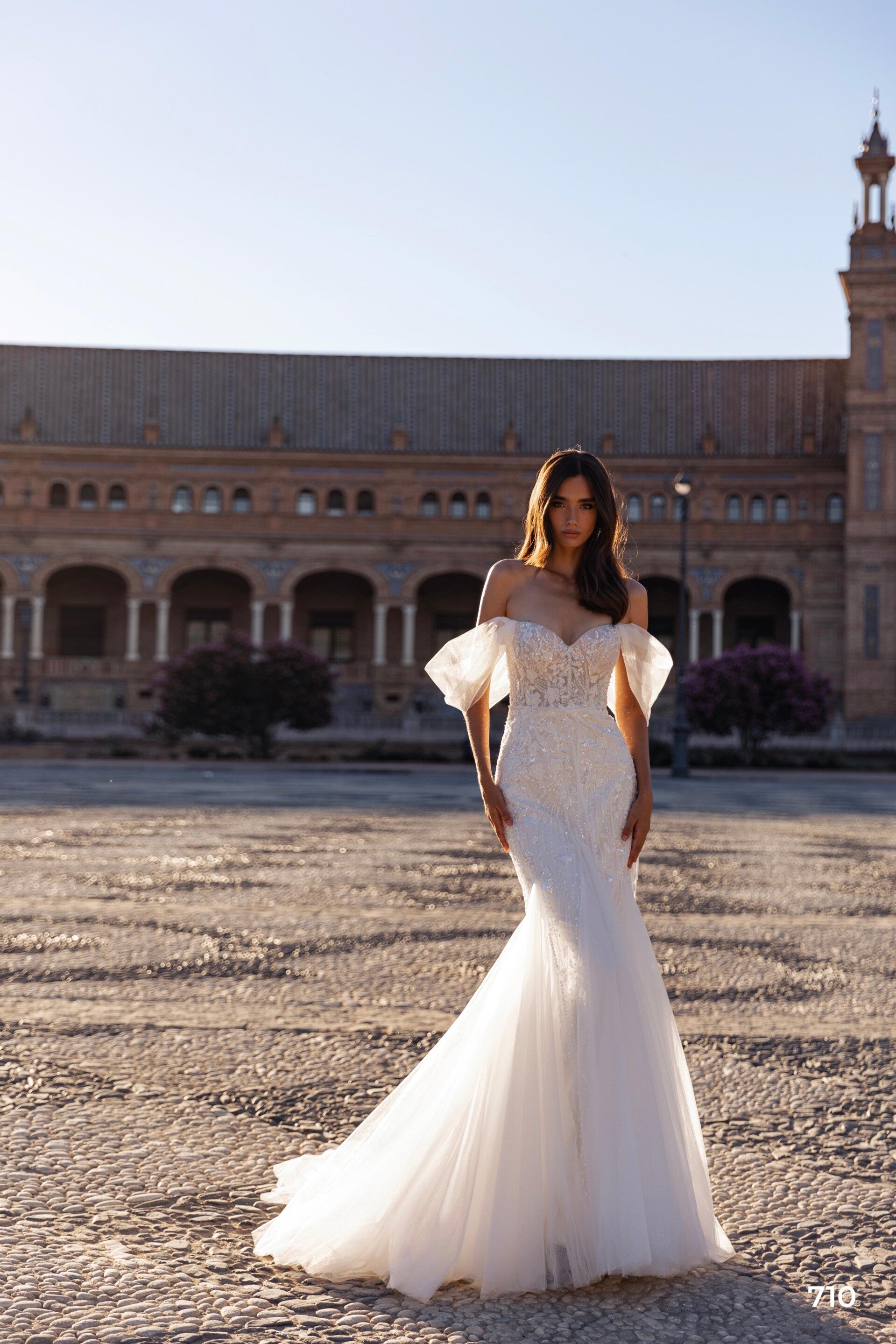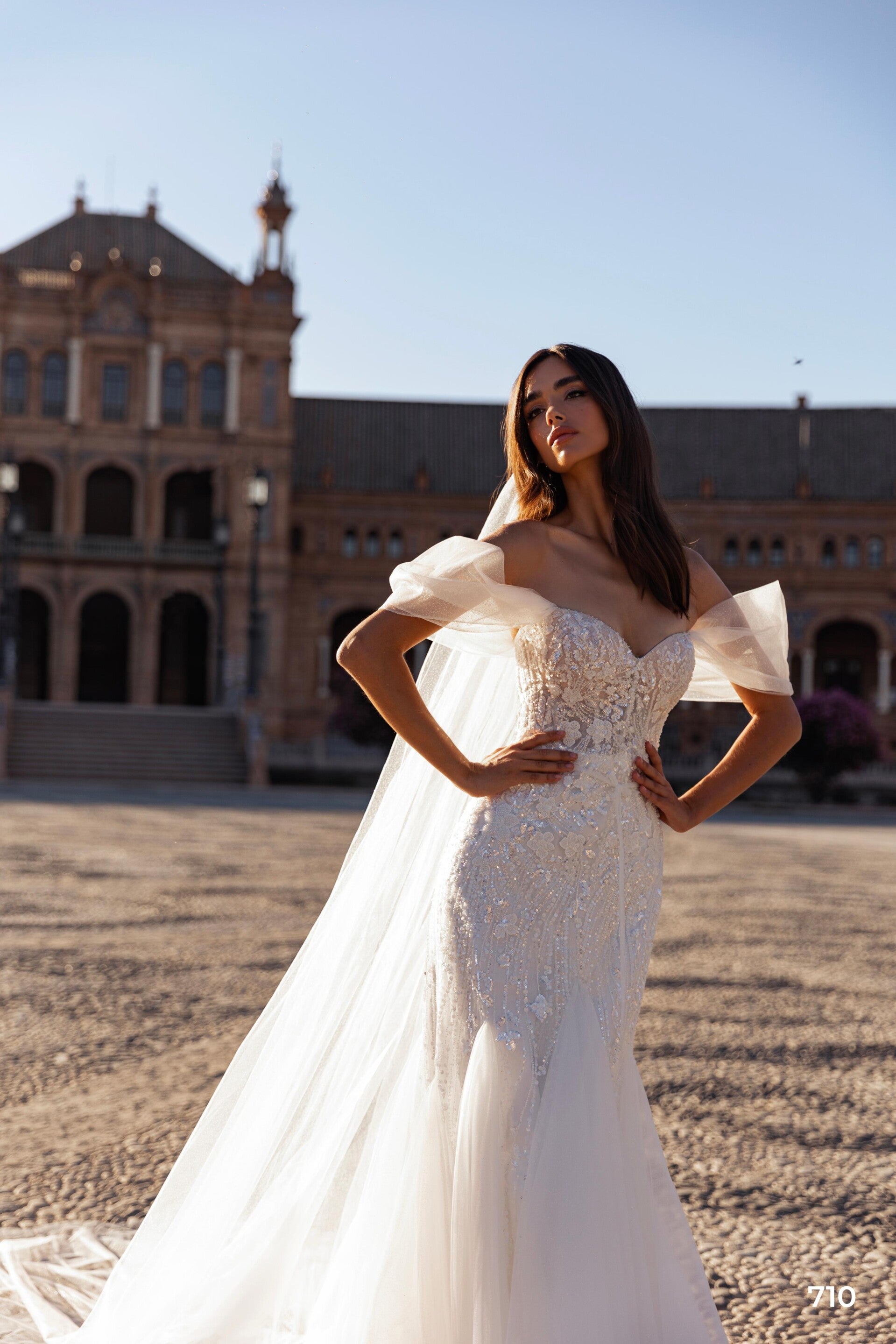 A contemporary mermaid-style dress with removable straps. The dress is adorned with embroidered guipure made of beads, pearls, and sequins, gracefully cascading onto the luxurious skirt with glittering pleats. There is also a removable belt, adorned with crystals at the bottom.