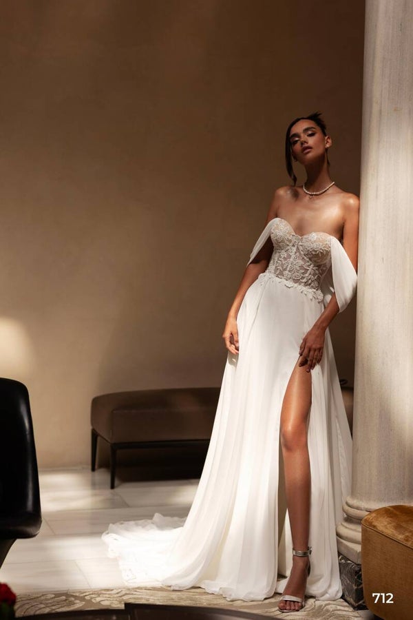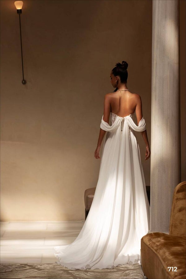 A delicate wedding dress with removable straps made of multi-chiffon. The corset is adorned with embroidered guipure and crystals, complementing the skirt beautifully. The skirt, crafted from multi-chiffon in a sun-pleated A-line style with a slit, comes with a 30 cm train.