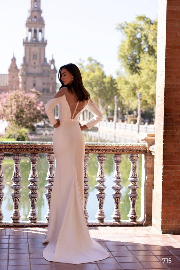 An exquisite mermaid-style dress made of crepe with an open back and shoulders, adorned with rich hand embroidery of pearls, crystals, and beads.