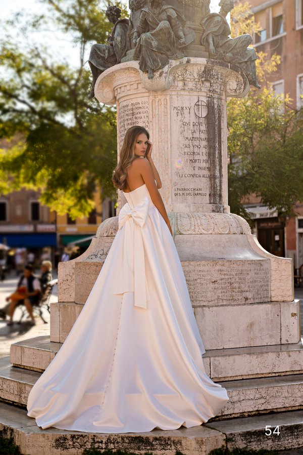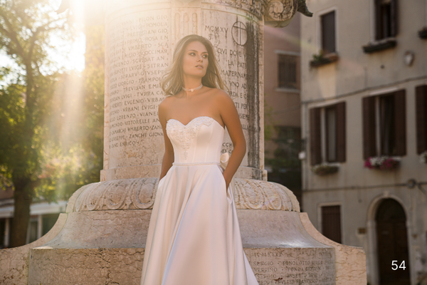 Elegance personified in this chic wedding dress featuring a tasteful removable bow at the back. The corset, crafted from sumptuous solid rolled fabric, is adorned with intricate embroidered guipure, accentuated by a dazzling crystal-embroidered belt. The A-silhouette skirt, constructed with finesse from durable rolled steel, seamlessly combines style and practicality with its pockets, while a graceful 50 cm train adds an extra touch of sophistication to this enchanting ensemble.