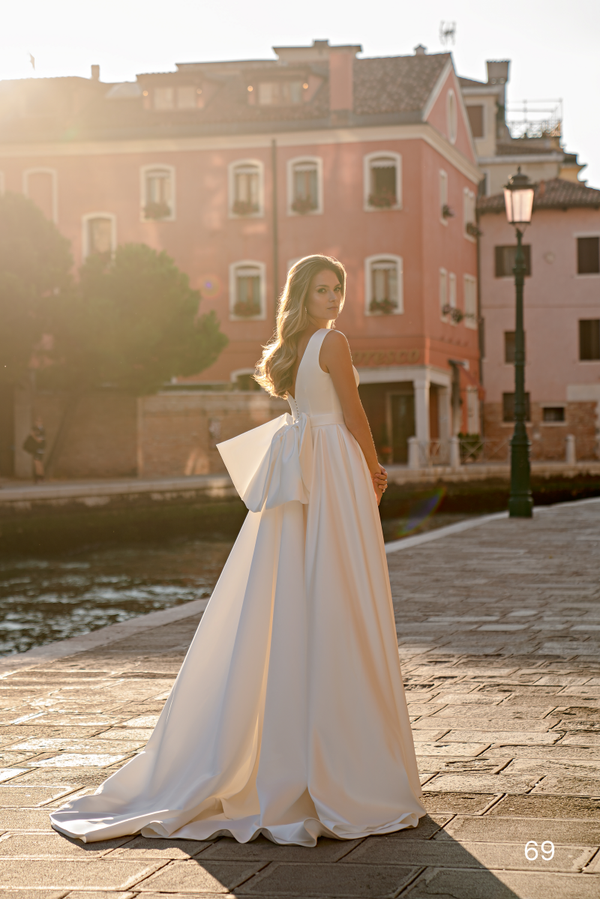 Step into elegance with this excellent wedding dress, crafted from solid satin and featuring a chic bow at the back. The allure continues with an attractive deep V-neck on the back, adding a touch of sophistication. The skirt, not only stylish but also practical, is adorned with pockets, while a graceful 50 cm train trails behind, completing the ensemble with timeless grace. Prepare for a breathtaking entrance on your special day in this truly exceptional gown.