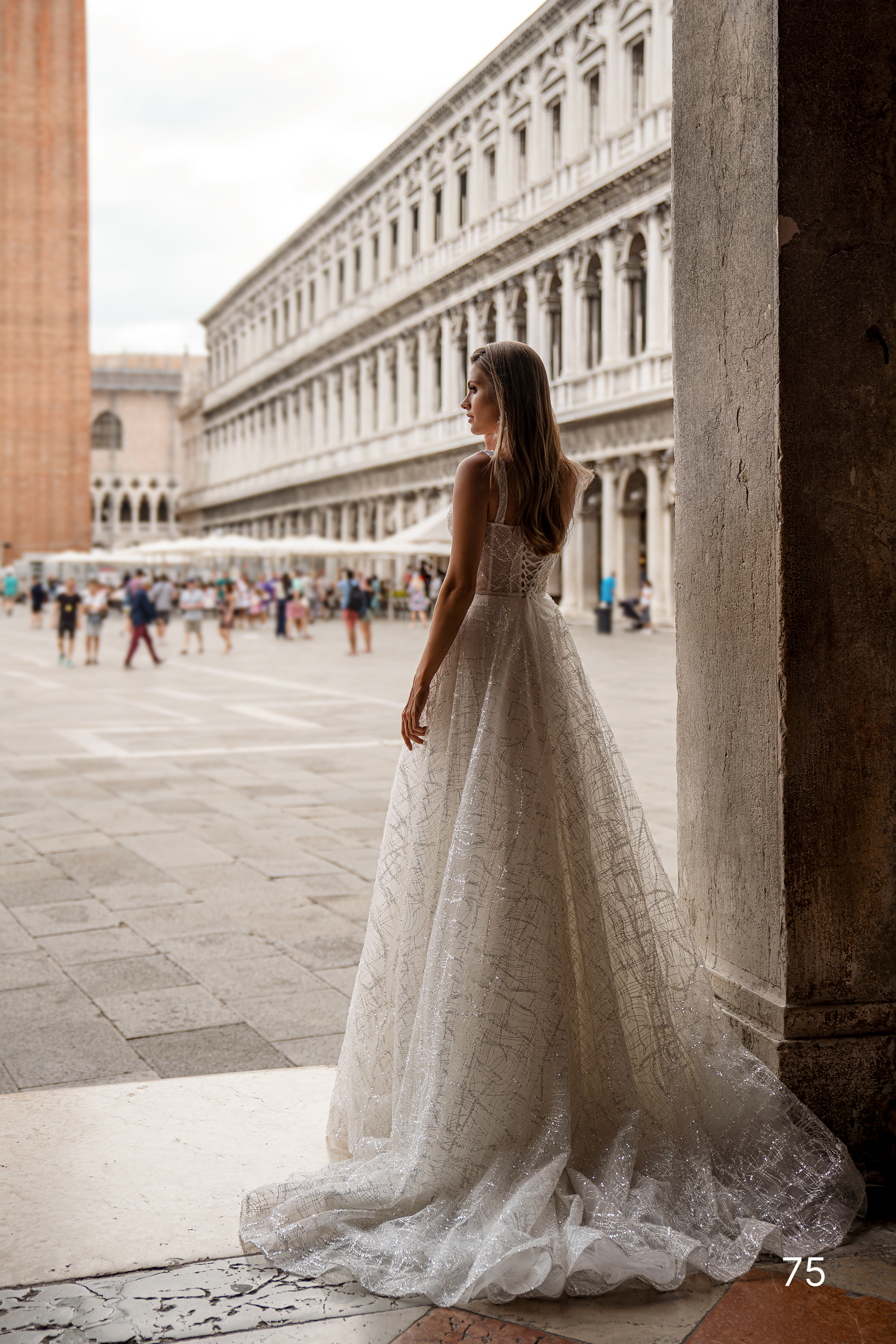 Incredible full guipure wedding dress. The corset, crafted from guipure and dram, exudes sophistication. Cups draped with European tulle and guipure add a touch of romance. The A-silhouette skirt, made of chic guipure, gracefully flows with a 30 cm train, creating a stunning silhouette. Lace and belt made of glitter embellish this exquisite ensemble, ensuring you radiate elegance and charm on your special day. Prepare for a breathtaking entrance in this mesmerizing wedding dress.